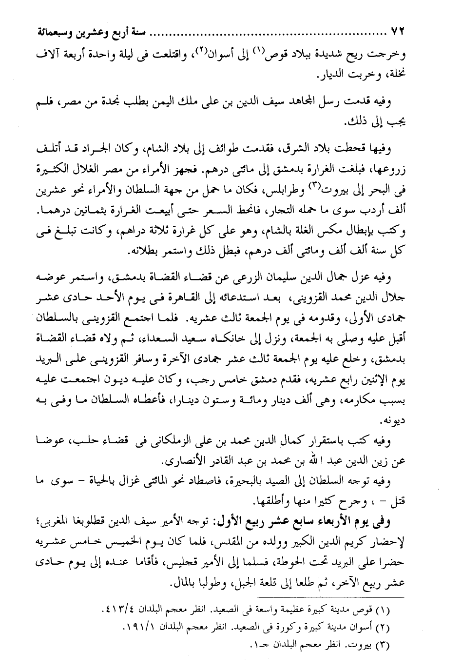 وَخرجت ريح شَدِيدَة بِبِلَاد قوص إِلَى أسوان واقتلعت فِي لَيْلَة وَاحِدَة أَرْبَعَة أُلَّاف نَخْلَة وَخَربَتْ الديار. وَفِيه قدمت رسل الْمُجَاهِد سيف الدّين بن عَليّ ملك الْيمن بِطَلَب نجدة من مصر فَلم يجب إِلَى ذَلِك. وفيهَا قحطت بِلَاد الشرق فَقدمت طوائف إِلَى بِلَاد الشَّام وَكَانَ الْجَرَاد قد أتلف زروعها فبلغت الغرارة بِدِمَشْق إِلَى مِائَتي دِرْهَم. فَجهز الْأُمَرَاء من مصر الغلال الْكَثِيرَة فِي الْبَحْر إِلَى بيروت وطرابلس فَكَانَ مَا حمل من جِهَة السُّلْطَان والأمراء نَحْو عشْرين ألف أردب سوى مَا حمله التُّجَّار فَانْحَطَّ السّعر حَتَّى أبيعت الغرارة بِثَمَانِينَ درهما. وَكتب بِإِبْطَال مكس الْغلَّة بِالشَّام وَهُوَ على كل غرارة ثَلَاثَة دَرَاهِم وكانث تبلغ فِي كل سنة ألف ألف ومائتي ألف دِرْهَم فَبَطل ذَلِك وَاسْتمرّ بُطْلَانه. وَفِيه عزل جمال الدّين سُلَيْمَان الزرعي عَن قَضَاء الْقُضَاة بِدِمَشْق وَاسْتمرّ عوضه جلال الدّين مُحَمَّد الْقزْوِينِي بعد استدعائه إِلَى الْقَاهِرَة فِي يَوْم الْأَحَد حادي عشر جُمَادَى الأولى وقدومه فِي يَوْم الْجُمُعَة ثَالِث عشريه. فَلَمَّا اجْتمع الْقزْوِينِي بالسلطان أقبل عَلَيْهِ وَصلى بِهِ الْجُمُعَة وَنزل إِلَى خانكاه سعيد السُّعَدَاء ثمَّ ولاه قَضَاء الْقُضَاة بِدِمَشْق وخلع عَلَيْهِ يَوْم الْجُمُعَة ثَالِث عشر جُمَادَى الْآخِرَة وسافر الْقزْوِينِي على الْبَرِيد يَوْم الْإِثْنَيْنِ رَابِع عشريه فَقدم دمشق خَامِس رَجَب وَكَانَ عَلَيْهِ دُيُون اجْتمعت عَلَيْهِ بِسَبَب مكارمه وَهِي ألف دِينَار وَمِائَة وَسِتُّونَ دِينَارا فَأعْطَاهُ وَفِيه كتب باستقرار كَمَال الدّين مُحَمَّد بن عَليّ الزملكاني فِي قَضَاء حلب عوضا عَن زين الدّين عبد الله بن مُحَمَّد بن عبد الْقَادِر الْأنْصَارِيّ. وَفِيه توجه السُّلْطَان إِلَى الصَّيْد بالبحيرة فاصطاد نَحْو المائتي غزال بِالْحَيَاةِ سوى مَا قتل وجرح كثيرا مِنْهَا وأطلقها. وَفِي يَوْم الْأَرْبَعَاء سَابِع عشر ربيع الأولى: توجه الْأَمِير سيف الدّين قطلوبغا المغربي لإحضار كريم الدّين الْكَبِير وَولده من الْمُقَدّس فَلَمَّا كَانَ يَوْم الْخَمِيس خَامِس عشريه حضرا على الْبَرِيد تَحت الحوطة فسلما إِلَى الْأَمِير قجليس فأقاما كنده إِلَى يَوْم حادي عشر ربيع الآخر ثمَّ طلعا إِلَى قلعة الْجَبَل وطولبا بِالْمَالِ.