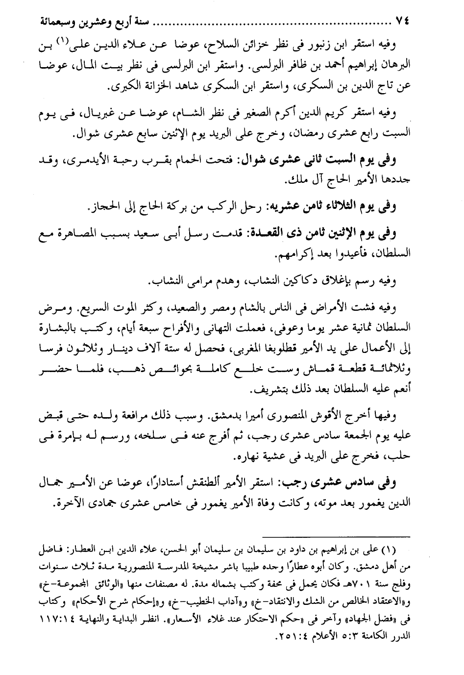 وَفِيه اسْتَقر ابْن زنبور فِي نظر خَزَائِن السِّلَاح عوضا عَن عَلَاء الدّين عَليّ بن الْبُرْهَان إِبْرَاهِيم أَحْمد بن ظافر الْبُرُلُّسِيّ. وَاسْتقر ابْن الْبُرُلُّسِيّ فِي نظر بَيت المَال عوضا عَن تَاج الدّين بن السكرِي وَاسْتقر ابْن السكرِي شَاهد الخزانة الْكُبْرَى. وَفِيه اسْتَقر كريم الدّين أكْرم الصَّغِير فِي نظر الشَّام عوضا عَن غبريال فِي يَوْم السبت رَابِع عشرى رَمَضَان وَخرج على الْبَرِيد يَوْم الْإِثْنَيْنِ سَابِع عشرى شَوَّال.