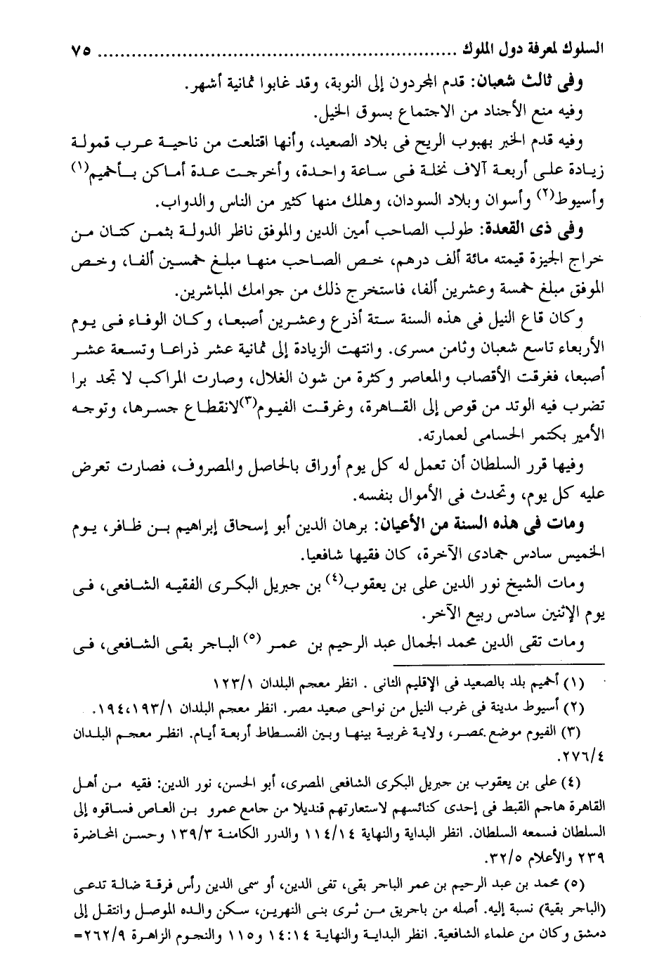 وَفِي ثَالِث شعْبَان: قدم المجردون إِلَى النّوبَة وَقد غَابُوا ثَمَانِيَة أشهر. وَفِيه منع الأجناد من الِاجْتِمَاع بسوق الْخَيل. وَفِيه قدم الْخَبَر بهبوب الرّيح فِي بِلَاد الصَّعِيد وَأَنَّهَا اقتلعت من نَاحيَة عرب قمولة زِيَادَة على أَرْبَعَة أُلَّاف نَخْلَة فِي سَاعَة وَاحِدَة وأخرحت عدَّة أَمَاكِن بأحميم وأسيوط وأسوان وبلاد السودَان وَهلك مِنْهَا كثير من النَّاس وَالدَّوَاب. وَفِي ذِي الْقعدَة: طُولِبَ الصاحب أَمِين الدّين والموفق نَاظر الدولة بِثمن كتَّان من خراج الجيزة قِيمَته مائَة ألف دِرْهَم خص الصاحب مِنْهَا مبلغ خمسين ألفا وَخص الْمُوفق مبلغ خَمْسَة وَعشْرين ألفا فاستخرج ذَلِك من جوامك المباشرين. وَكَانَ قاع النّيل فِي هَذِه السّنة سِتَّة أَذْرع وَعشْرين أصبعاً وَكَانَ الْوَفَاء فِي يَوْم الْأَرْبَعَاء تَاسِع شعْبَان وثامن مسرى. وانتهت الزِّيَادَة إِلَى ثمانيه عشر ذِرَاعا وَتِسْعَة عشمر أصبعاً فغرقت الأقصاب والمعاصر وَكَثْرَة من شون الغلال وَصَارَت المراكب لَا تَجِد برا تضرب فِيهِ الوتد من قوص إِلَى الْقَاهِرَة وغرقت الفيوم لانْقِطَاع جسرها وَتوجه الْأَمِير بكتمر الحسامي لعمارته. وفيهَا قرر السُّلْطَان أَن تعْمل لَهُ كل يَوْم أوراق بالحاصل والمصروف فَصَارَت تعرض عَلَيْهِ كل يَوْم وتحدث فِي الْأَمْوَال بِنَفسِهِ. وَمَات فِي هَذِه السّنة من الْأَعْيَان برهَان الدّين أَبُو اسحاق إِبْرَاهِيم بن ظافر يَوْم الْخَمِيس سادس جُمَادَى الْآخِرَة كَانَ فَقِيها شافعياً. وَمَات الشيح نور الدّين عَليّ بن يَعْقُوب بن جِبْرِيل الْبكْرِيّ الْفَقِيه الشَّافِعِي فِي يَوْم الْإِثْنَيْنِ سادس وَمَات تَقِيّ الدّين مُحَمَّد الْجمال عبد الرَّحِيم بن عمر الباجر بَقِي الشَّافِعِي فِي