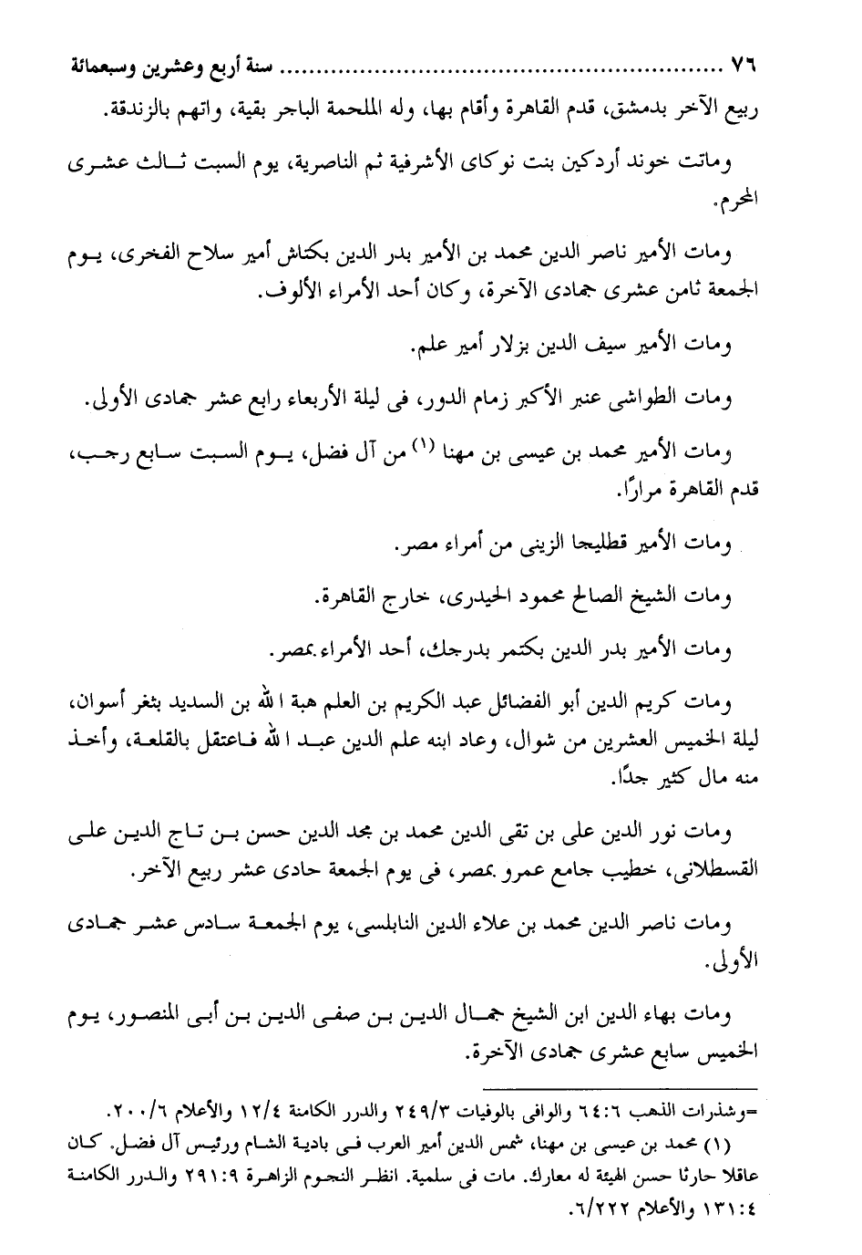 ربيع الآخر بِدِمَشْق قدم الْقَاهِرَة وَأقَام بهَا وَله الملحمة الباجر بَقِيَّة واتهم بالزندقة. وَمَاتَتْ خوند أردكين بنت نوكاي الأشرفية ثمَّ الناصرية يَوْم السبت ثَالِث عشرى الْمحرم. وَمَات الْأَمِير نَاصِر الدّين مُحَمَّد بن الْأَمِير بدر الدّين بكتاش أَمِير سلَاح الفخري يَوْم الْجُمُعَة ثامن عشرى جُمَادَى الْآخِرَة وَكَانَ أحد الْأُمَرَاء الألوف. وَمَات الْأَمِير سيف الدّين بزلار أَمِير علم. وَمَات الطواشي عنبر الْأَكْبَر زِمَام الدّور فِي لَيْلَة الْأَرْبَعَاء رَابِع عشر جُمَادَى الأولى. وَمَات الْأَمِير مُحَمَّد بن عيس بن مهنا من آل فضل يَوْم السبت سَابِع رَجَب قدم الْقَاهِرَة مرَارًا. وَمَات الْأَمِير قطليجا الزيني من أُمَرَاء مصر. وَمَات الشَّيْخ الصَّالح مَحْمُود الحيدري خَارج الْقَاهِرَة. وَمَات الْأَمِير بدر الدّين بكتمر بدرجك أحد الْأُمَرَاء بِمصْر. وَمَات كريم الدّين أَبُو الْفَضَائِل عبد الْكَرِيم بن الْعلم هبة الله بن السديد بثغر أسوان لَيْلَة الْخَمِيس الْعشْرين من شَوَّال وَعَاد ابْنه علم الدّين عبد الله فاعتقل بالقلعة وَأخذ مِنْهُ مَال كثير وَمَات نور الدّين عَليّ بن تَقِيّ الدّين مُحَمَّد بن مجد الدّين حسن بن تَاج الدّين عَليّ الْقُسْطَلَانِيّ خطيب جَامع عَمْرو بِمصْر فِي يَوْم الْجُمُعَة حادي عشر ربيع الآخر. وَمَات نَاصِر الدّين مُحَمَّد بن عَلَاء الدّين النابلسي يَوْم الْجُمُعَة سادس عشر جُمَادَى الأولى. وَمَات بهاء الدّين ابْن الشَّيْخ جمال الدّين بن صفي الدّين بن أبي الْمَنْصُور يَوْم الْخَمِيس سَابِع عشرى جُمَادَى الْآخِرَة.