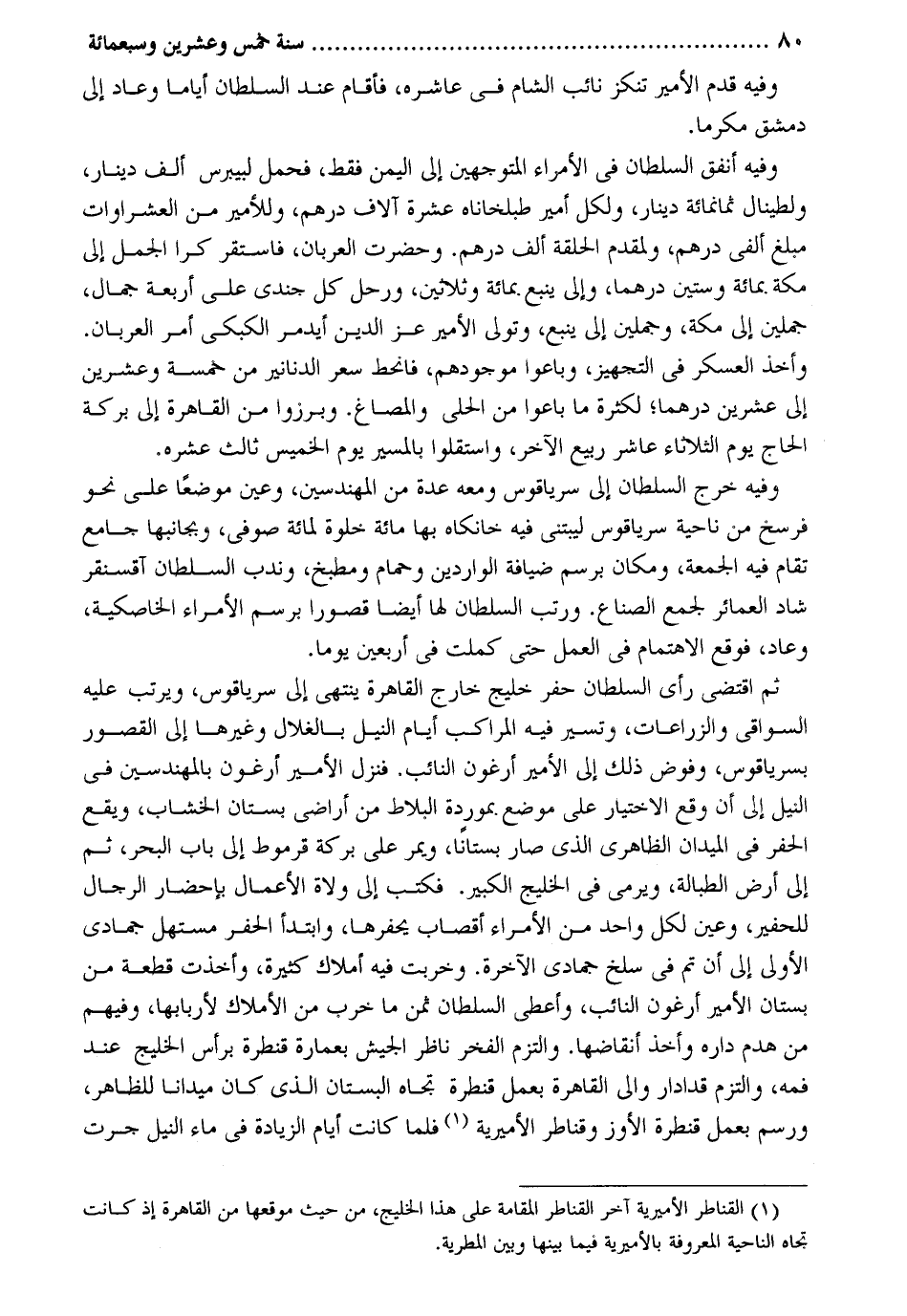 وَفِيه قدم الْأَمِير تنكز نَائِب الشَّام فِي عاشره فَأَقَامَ عِنْد السُّلْطَان أَيَّامًا وَعَاد إِلَى دمشق مكرماً. وَفِيه أنْفق السُّلْطَان فِي الْأُمَرَاء المتوجهين إِلَى الْيمن فَقَط فَحمل لبيبرس ألف دِينَار ولطينال ثَمَانمِائَة دِينَار وَلكُل أَمِير طبلخاناه عشرَة أُلَّاف دِرْهَم وللأمير من العشراوات مبلغ ألفي دِرْهَم ولمقدم الْحلقَة ألف دِرْهَم. وَحَضَرت العربان فاستقر كرا الْجمل إِلَى مَكَّة بِمِائَة وَسِتِّينَ درهما وَإِلَى يَنْبع بِمِائَة وَثَلَاثِينَ ورحل كل جندي على أَرْبَعَة جمال جملين إِلَى مَكَّة وجملين إِلَى يَنْبع وَتَوَلَّى الْأَمِير عز الدّين أيدمر الكبكي أَمر العربان وَأخذ الْعَسْكَر فِي التَّجْهِيز وَبَاعُوا موجودهم فَانْحَطَّ سعر الدَّنَانِير من خَمْسَة وَعشْرين إِلَى عشْرين درهما لِكَثْرَة مَا باعوا من الْحلِيّ والمصاغ. وبرزوا من الْقَاهِرَة إِلَى بركَة الْحَاج يَوْم الثُّلَاثَاء عَاشر ربيع الآخر واستقلوا بِالْمَسِيرِ يَوْم الْخَمِيس ثَالِث عشره. وَفِيه خرج السُّلْطَان إِلَى سرياقوس وَمَعَهُ عدَّة من المهندسين وَعين موضعا على نَحْو فَرسَخ من نَاحيَة سرياقوس ليبتني فِيهِ خانكاه بهَا مائَة خلْوَة لمِائَة صوفي وبجانبها جَامع تُقَام فِيهِ الْجُمُعَة وَمَكَان برسم ضِيَافَة الواردين وحمام ومطبخ وَندب السُّلْطَان آقسنقر شاد العمائر لجمع الصناع. ورتب السُّلْطَان لَهَا أَيْضا قصوراً برسم الْأُمَرَاء الخاصكية وَعَاد فَوَقع الإهتمام فِي الْعَمَل حَتَّى كملت فِي أَرْبَعِينَ يَوْمًا. ثمَّ اقْتضى رَأْي السُّلْطَان حفر خليج خَارج الْقَاهِرَة يَنْتَهِي إِلَى سرياقوس ويرتب عَلَيْهِ السواقي والزراعات وتسير فِيهِ المراكب أَيَّام النّيل بالغلال وَغَيرهَا إِلَى الْقُصُور بسرياقوس وفوض ذَلِك إِلَى الْأَمِير أرغون النَّائِب. فَنزل الْأَمِير أرغون بالمهندسين فِي النّيل إِلَى أَن وَقع الِاخْتِيَار على مَوضِع بموردة البلاط من أَرَاضِي بُسْتَان الخشاب وَيَقَع الْحفر فِي الميدان الظَّاهِرِيّ الَّذِي صَار بستاناً ويمر على بركَة قرموط إِلَى بَاب الْبَحْر ثمَّ إِلَى أَرض الطبالة ويرمى فِي الخليج الْكَبِير. فَكتب إِلَى وُلَاة الْأَعْمَال بإحضار الرِّجَال للحفير وَعين لكل وَاحِد من الْأُمَرَاء أقصاب يحفرها وابتدأ الْحفر مستهل جُمَادَى الأولى إِلَى أَن تمّ فِي سلخ جُمَادَى الْآخِرَة. وَخَربَتْ فِيهِ أَمْلَاك كَثِيرَة وَأخذت قِطْعَة من بُسْتَان الْأَمِير أرغون النَّائِب وَأعْطى السُّلْطَان ثمن مَا خرب من الْأَمْلَاك لأربابها وَفِيهِمْ من هدم دَاره وَأخذ أنقاضها. وَالْتزم الْفَخر نَاظر الْجَيْش بعمارة قنطرة بِرَأْس الخليج عِنْد فَمه وَالْتزم قدادار وَالِي الْقَاهِرَة بِعَمَل قنطرة تجاه الْبُسْتَان الَّذِي كَانَ ميداناً للظَّاهِر ورسم بِعَمَل قنطرة الأوز وقناطر الأميرية فَلَمَّا كَانَت أَيَّام الزِّيَادَة فِي مَاء النّيل جرت