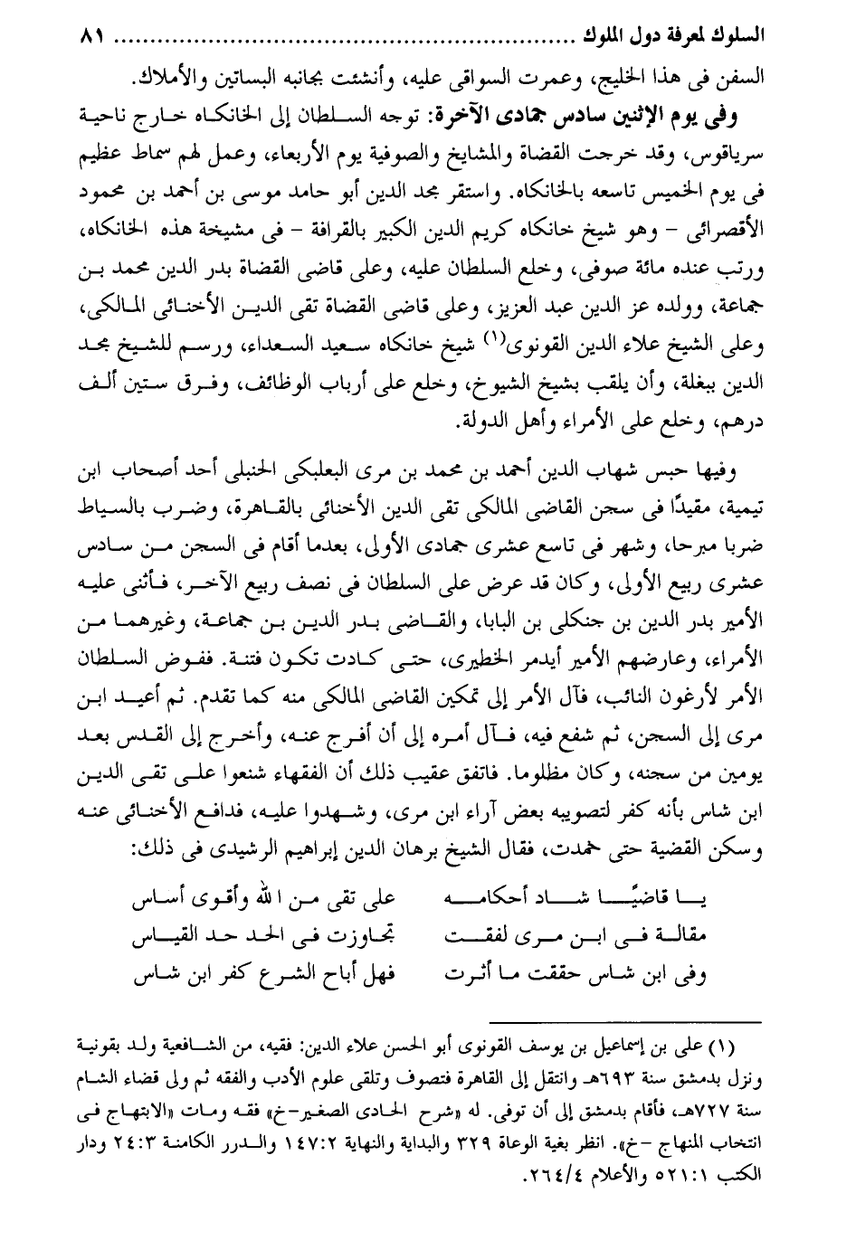 السفن فِي هَذَا الخليج، وعمرت السوافي عَلَيْهِ، وأنشئت بجانبه الْبَسَاتِين والأملاك. وَفِي يَوْم الْإِثْنَيْنِ سادس جُمَادَى الْآخِرَة: توجه السُّلْطَان إِلَى الخانكاه خَارج نَاحيَة سرياقوس وَقد خرجت الْقُضَاة والمشايخ والصوفية يَوْم الْأَرْبَعَاء وَعمل لَهُم سماط عَظِيم فِي يَوْم الْخَمِيس تاسعه بالخانكاه. وَاسْتقر مجد الدّين أَبُو حَامِد مُوسَى بن أَحْمد بن مَحْمُود الأقصرائي وَهُوَ شيح خانكاه كريم الدّين الْكَبِير بالقرافة فِي مشيخة هَذِه الخانكاه ورتب عِنْده مائَة صوفي وخلع السُّلْطَان عَلَيْهِ وعَلى قَاضِي الْقُضَاة بدر الدّين مُحَمَّد بن جمَاعَة وَولده عز الدّين عبد الْعَزِيز وعَلى قَاضِي الْقُضَاة تَقِيّ الدّين الأخنائي الْمَالِكِي وعَلى الشَّيْخ عَلَاء الدّين القونوي شيخ خانكاه سعيد السُّعَدَاء ورسم للشَّيْخ مجد الدّين ببغلة وَأَن يلقب بشيخ الشُّيُوخ وخلع على أَرْبَاب الوظالف وَفرق سِتِّينَ ألف دِرْهَم وخلع على الْأُمَرَاء وَأهل الدولة. وفيهَا حبس شهَاب الدّين أَحْمد بن مُحَمَّد بن مري البعلبكي الْحَنْبَلِيّ أحد أَصْحَاب ابْن تَيْمِية مُقَيّدا فِي سجن القَاضِي الْمَالِكِي تَقِيّ الدّين الأخنائي بِالْقَاهِرَةِ وَضرب بالسياط ضربا مبرحاً وَشهر فِي تَاسِع عشرى جُمَادَى الأولى بَعْدَمَا أَقَامَ فِي السجْن من سادس عشرى ربيع الأولى وَكَانَ قد عرض على السُّلْطَان فِي نصف ربيع الآخر فَأثْنى عَلَيْهِ الْأَمِير بدر الدّين بن جنكلي بن البابا وَالْقَاضِي بدر الدّين بن جمَاعَة وَغَيرهمَا من الْأُمَرَاء وعارضهم الْأَمِير أيدمر الخطيري حَتَّى كَادَت تكون فتْنَة. ففوض السُّلْطَان الْأَمر لأرغون النَّائِب فآل الْأَمر إِلَى تَمْكِين القَاضِي الْمَالِكِي مِنْهُ كَمَا تقدم. ثمَّ أُعِيد ابْن مري إِلَى السجْن ثمَّ شفع فِيهِ فآل أمره إِلَى أَن أفرج عَنهُ وَأخرج إِلَى الْقُدس بعد يَوْمَيْنِ من سجنه وَكَانَ مَظْلُوما. فاتفق عقيب ذَلِك أَن الْفُقَهَاء شنعوا على تَقِيّ الدّين ابْن شَاس بِأَنَّهُ كفر لتصويبه بعض أراء ابْن مري وشهدوا عَلَيْهِ فدافع الأخنائي عَنهُ وَسكن الْقَضِيَّة حَتَّى خمدت فَقَالَ الشَّيْخ برهَان الدّين إِبْرَاهِيم الرَّشِيدِيّ فِي ذَلِك: يَا قَاضِيا شاد أَحْكَامه على تقى من الله وَأقوى أساس مقَالَة فِي ابْن مرى لفقت تجاوزت فِي الْحَد حد الْقيَاس وفى ابْن شَاس حققت مَا أثرت فَهَل أَبَاحَ الشَّرْع كفر ابْن شَاس
