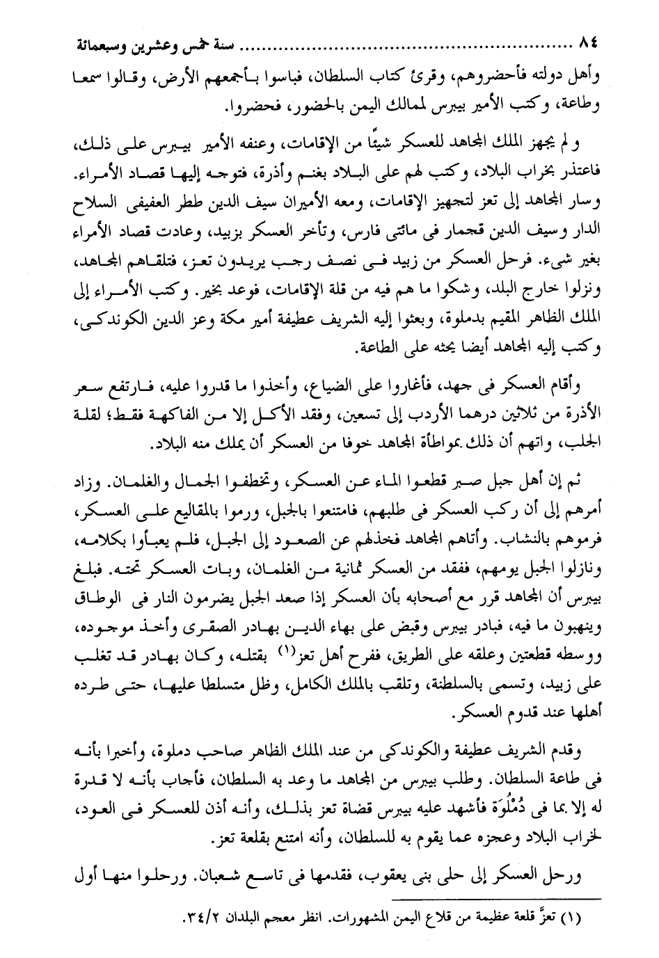 وَأهل دولته فأحضروهم وَقُرِئَ كتاب السُّلْطَان فباسوا بأجمعهم الأَرْض وَقَالُوا سمعا وَطَاعَة وَكتب الْأَمِير بيبرس لممالك أليمن وَلم يُجهز الْملك الْمُجَاهِد للعسكر شَيْئا من الإقامات وعنفه الْأَمِير بيبرس على ذَلِك فَاعْتَذر بخراب الْبِلَاد وَكتب لَهُم على الْبِلَاد بِغنم وأذرة فَتوجه إِلَيْهَا قصاد الْأُمَرَاء. وَسَار الْمُجَاهِد إِلَى تعز لتجهيز الإقامات وَمَعَهُ الأميران سيف الدّين ططر العفيفي السِّلَاح الدَّار وَسيف الدّين قجمار فِي مِائَتي فَارس وَتَأَخر الْعَسْكَر بزبيد وعادت قصاد الْأُمَرَاء بِغَيْر شَيْء فَرَحل الْعَسْكَر من زبيد فِي نصف رَجَب يُرِيدُونَ تعز فَتَلقاهُمْ الْمُجَاهِد ونزلوا خَارج الْبَلَد وَشَكوا مَا هم فِيهِ من قلَّة الإقامات فوعد بِخَير. وَكتب الْأُمَرَاء إِلَى الْملك الظَّاهِر الْمُقِيم بدملوة وبعثوا إِلَيْهِ الشريف عطفة أَمِير مَكَّة وَعز الدّين الكوندكي وَكتب إِلَيْهِ الْمُجَاهِد أَيْضا يحثه على الطَّاعَة. وَأقَام الْعَسْكَر فِي جهد فَأَغَارُوا على الضّيَاع وَأخذُوا مَا قدرُوا عَلَيْهِ فارتفع سعر الأذرة من ثَلَاثِينَ درهما الأردب إِلَى تسعين وفقد الْأكل إِلَّا من الْفَاكِهَة فَقَط لقلَّة الجلب واتهم أَن ذَلِك بمواطأة الْمُجَاهِد خوفًا من الْعَسْكَر أَن يملك مِنْهُ الْبِلَاد. ثمَّ إِن أهل جبل صَبر قطعُوا المَاء عَن الْعَسْكَر وتخطفوا الْجمال والغلمان. وَزَاد أَمرهم إِلَى أَن ركب الْعَسْكَر فِي طَلَبهمْ فامتنعوا بِالْجَبَلِ ورموا بالمقاليع على الْعَسْكَر فَرَمَوْهُمْ بالنشاب. وأتاهم الْمُجَاهِد فخذلهم عَن الصعُود إِلَى الْجَبَل فَلم يعبأوا بِكَلَامِهِ ونازلوا الْجَبَل يومهم ففقد من الْعَسْكَر ثَمَانِيَة من الغلمان وَبَات الْعَسْكَر تَحْتَهُ. فَبلغ بيبرس أَن الْمُجَاهِد قرر مَعَ أَصْحَابه بِأَن الْعَسْكَر إِذا صعد الْجَبَل يضرمون النَّار فِي الوطاق وينهبون مَا فِيهِ فبادر بيبرس وَقبض على بهاء الدّين بهادر الصقري وَأخذ موجوده ووسطه قطعتين وعلقه على الطَّرِيق ففرح أهل تعز بمتله وَكَانَ بهادر قد تغلب على زبيد وَتسَمى بالسلطنة وتلقب بِالْملكِ الْكَامِل وظل متسلطاً عَلَيْهَا حَتَّى طرده أَهلهَا عِنْد قدوم الْعَسْكَر. وَقدم الشريف عطفة والكوندكي من عِنْد الْملك الظَّاهِر صَاحب دملوة وأخبرا بِأَنَّهُ فِي طَاعَة السُّلْطَان. وَطلب بيبرس من الْمُجَاهِد مَا وعد بِهِ السُّلْطَان فَأجَاب بِأَنَّهُ لَا قدرَة لَهُ إِلَّا بِمَا فِي دملوة فَأشْهد عَلَيْهِ بيبرس قُضَاة تعز بذلك وَأَنه أذن للعسكر فِي الْعود لخراب الْبِلَاد وعجزه عَمَّا يقوم بِهِ للسُّلْطَان وَأَنه امْتنع بقلعة تعز. ورحل الْعَسْكَر إِلَى حلي بني يعفوب فَقَدمهَا فِي تَاسِع شعْبَان. ورحلوا مِنْهَا أول