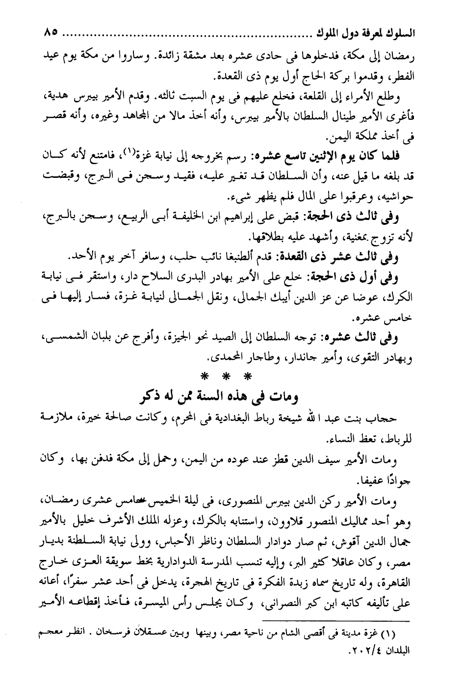 رَمَضَان إِلَى مَكَّة فَدَخَلُوهَا فِي حادي عشره بعد مشقة زَائِدَة. وَسَارُوا من مَكَّة يَوْم عيد الْفطر وَقدمُوا بركَة الْحَاج أول يَوْم ذِي الْقعدَة. وطلع الْأُمَرَاء إِلَى القلعة فَخلع عَلَيْهِم فِي يَوْم السبت ثالثه. وَقدم الْأَمِير بيبرس هَدِيَّة فأغرى الْأَمِير طينال السُّلْطَان بالأمير بيبرس وَأَنه أَخذ مَالا من الْمُجَاهِد وَغَيره وَأَنه قصر فِي أَخذ مملكة الْيمن. فَلَمَّا كَانَ يَوْم الْإِثْنَيْنِ تَاسِع عشره: رسم بِخُرُوجِهِ إِلَى نِيَابَة غَزَّة فَامْتنعَ لِأَنَّهُ كَانَ قد بلغه مَا قيل عَنهُ وَأَن السُّلْطَان قد تغير عَلَيْهِ فقيد وسجن فِي البرج وقبضت حَوَاشِيه وعرقبوا على المَال فَلم يظْهر شَيْء. وَفِي ثَالِث ذِي الْحجَّة: قبض على إِبْرَاهِيم ابْن الْخَلِيفَة أبي الرّبيع وسجن بالبرج لِأَنَّهُ تزوج بمغنية وَأشْهد عَلَيْهِ بِطَلَاقِهَا. وَفِي ثَالِث عشر ذِي الْقعدَة: قدم ألطبغا نَائِب حلب وسافر أخر يَوْم الْأَحَد. وَفِي أول ذِي الْحجَّة: خلع على الْأَمِير بهادر البدري السِّلَاح دَار وَاسْتقر فِي لنيابة الكرك عوضا عَن عز الدّين أيبك الجمالي وَنقل الجمالي لنيابة غَزَّة فَسَار إِلَيْهَا فِي خَامِس عشره. وَفِي ثَالِث عشره: توجه السُّلْطَان إِلَى الصَّيْد نَحْو الجيزة وَأَفْرج عَن بلبان الشمسي وبهادر التَّقْوَى وأمير جاندار وطاجار المحمدي. وَمَات فِي هَذِه السّنة مِمَّن لَهُ ذكر حجاب بنت عبد الله شيخة رِبَاط البغدادية فِي الْمحرم وَكَانَت صَالِحَة خيرة مُلَازمَة للرباط تعظ النِّسَاء. وَمَات الْأَمِير سيف الدّين قطز عِنْد عوده من الْيمن وَحمل إِلَى مَكَّة فَدفن بهَا وَكَانَ جواداً عفيفاً. وَمَات الْأَمِير ركن الدّين بيبرس الْمَنْصُور فِي لَيْلَة الْخَمِيس خَامِس عشرى رَمَضَان وَهُوَ أحد مماليك الْمَنْصُور قلاوون واستنابه بالكرك وعزله الْملك الْأَشْرَف خَلِيل بالأمير جمال الدّين أقوش ثمَّ صَار دوادار السُّلْطَان وناظر الأحباس وَولي نِيَابَة السلطنة بديار مصر وَكَانَ عَاقِلا كثير الْبر وَإِلَيْهِ تنْسب الْمدرسَة الدوادارية بِخَط سويقة الْعزي خَارج الْقَاهِرَة وَله تَارِيخ سَمَّاهُ زبدة الفكرة فِي تَارِيخ الْهِجْرَة يدْخل فِي أحد عشر سفرا أَعَانَهُ على تأليفه كَاتبه ابْن كبر النَّصْرَانِي وَكَانَ يجلس رَأس الميسرة فَأخذ إقطاعه الْأَمِير
