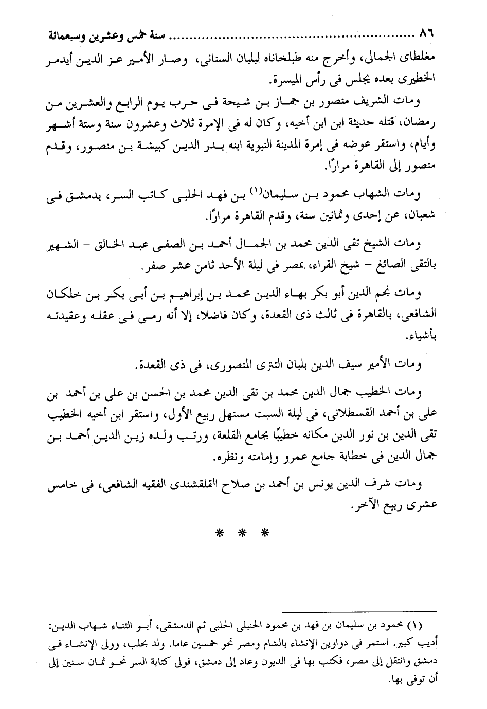 مغلطاي الْجمال وَأخرج مِنْهُ طبلخاناه لبلبان السناني وَصَارَ الْأَمِير عز الدّين أيدمر الخطيري بعده يجلس فِي رَأس الميسرة. وَمَات الشريف مَنْصُور بن جماز بن شيحة فِي حَرْب يَوْم الرَّابِع وَالْعِشْرين من رمصان قَتله حَدِيثَة ابْن ابْن أَخِيه وَكَانَ لَهُ فِي الإمرة ثَلَاث وَعِشْرُونَ سنة وَسِتَّة أشهر وَأَيَّام وَاسْتقر عوضه فِي إمرة الْمَدِينَة النَّبَوِيَّة ابْنه بدر الدّين كبيشة بن مَنْصُور وَقدم مَنْصُور إِلَى الْقَاهِرَة مرَارًا. وَمَات الشهَاب مَحْمُود بن سُلَيْمَان بن فَهد الْحلَبِي كَاتب السِّرّ بِدِمَشْق فِي شعْبَان عَن إِحْدَى وَثَمَانِينَ سنة وَقدم الْقَاهِرَة مرَارًا. وَمَات الشَّيْخ تَقِيّ الدّين مُحَمَّد بن الْجمال أَحْمد بن الصفي عبد الْخَالِق الشهير بالتقي الصَّائِغ شيخ الْقُرَّاء بِمصْر فِي لَيْلَة الْأَحَد ثامن عشر صفر. وَمَات نجم الدّين أَبُو بكر بهاء الدّين مُحَمَّد بن إِبْرَاهِيم بن أبي بكر بن خلكان الشَّافِعِي بِالْقَاهِرَةِ فِي ثَالِث ذِي الْقعدَة وَكَانَ فَاضلا إِلَّا أَنه رمي فِي عقله وعقيدته بأَشْيَاء. وَمَات الْأَمِير سيف الدّين بلبان التتري المنصوري فِي ذِي الْقعدَة. وَمَات الْخَطِيب جمال الدّين مُحَمَّد بن تَقِيّ الدّين مُحَمَّد بن الْحسن بن عَليّ بن أَحْمد بن عَليّ بن أَحْمد القسطلان فِي لَيْلَة السبت مستهل ربيع الأول وَاسْتقر ابْن أَخِيه الْخَطِيب تَقِيّ الدّين بن نور الدّين مَكَانَهُ خَطِيبًا بِجَامِع القلعة ورتب وَلَده زين الدّين أَحْمد بن جمال الدّين فِي خطابة جَامع عَمْرو وإمامته وَنَظره. وَمَات شرف الدّين يُونُس بن أَحْمد بن صَلَاح القلقشندي الْفَقِيه الشَّافِعِي فِي خَامِس عشرى ربيع الآخر.