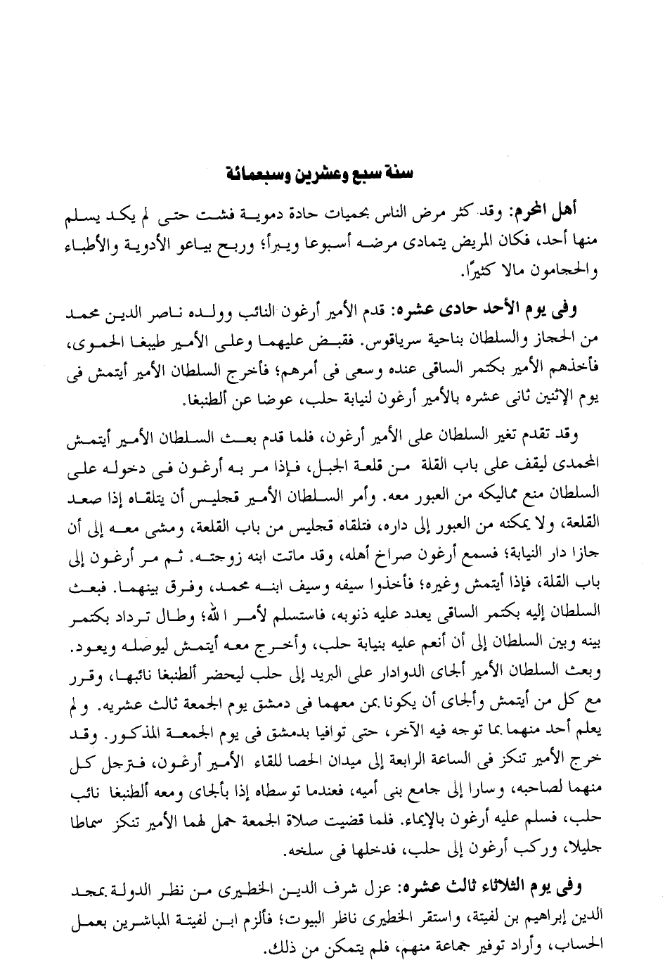 سنة سبع وَعشْرين وَسَبْعمائة أهل الْمحرم: وَقد كثر مرض النَّاس بحميات حادة دموية فَشَتْ حَتَّى لم يكد يسلم مِنْهَا أحد فَكَانَ الْمَرِيض يتمادى مَرضه أسبوعاً وَيبرأ وَربح بياعو الْأَدْوِيَة والأطباء والحجامون مَالا كثيرا. وَفِي يَوْم الْأَحَد حادي عشره: قدم الْأَمِير أرغون النَّائِب وَولده نَاصِر الدّين مُحَمَّد من الْحجاز وَالسُّلْطَان بِنَاحِيَة سرياقوس فَقبض عَلَيْهِمَا وعَلى الْأَمِير طيبغا الْحَمَوِيّ فَأَخذهُم الْأَمِير بكتمر الساقي عِنْده وسعى فِي أَمرهم فَأخْرج السُّلْطَان الْأَمِير أيتمش فِي يَوْم الْإِثْنَيْنِ ثَانِي عشره بالأمير أرغون لنيابة حلب عوضا عَن ألطنبغا. وَقد تقدم تغير السُّلْطَان على الْأَمِير أرغون فَلَمَّا قدم بعث السُّلْطَان الْأَمِير أيتمش المحمدي ليقف على بَاب الْقلَّة من قلعة الْجَبَل فَإِذا مر بِهِ أرغون فِي دُخُوله على السُّلْطَان منع مماليكه من العبور مَعَه. وَأمر السُّلْطَان الْأَمِير قجليس أَن يتلقاه إِذا صعد القلعة وَلَا يُمكنهُ من العبور إِلَى دَاره فَتَلقاهُ قجليس من بَاب القلعة وَمَشى مَعَه إِلَى أَن جازا دَار النِّيَابَة فَسمع أرغون صُرَاخ أَهله وَقد مَاتَت ابْنة زَوجته. ثمَّ مر أرغون إِلَى بَاب الْقلَّة فَإِذا أيتمش وَغَيره فَأخذُوا سَيْفه وَسيف ابْنه مُحَمَّد وَفرق بَينهمَا. فَبعث السُّلْطَان إِلَيْهِ بكتمر الساقي يعدد عَلَيْهِ ذنُوبه فاستسلم لأمر الله. وَطَالَ ترداد بكتمر بَينه وَبَين السُّلْطَان إِلَى أَن أنعم عَلَيْهِ بنيابة حلب وَأخرج مَعَه أيتمش ليوصله وَيعود. وَبعث السُّلْطَان الْأَمِير ألجاي الدوادار على الْبَرِيد إِلَى حلب ليحضر ألطنبغا نائبها وَقرر مَعَ كل من أيتمش وألجاي أَن يَكُونَا بِمن مَعَهُمَا فِي دمشق يَوْم الْجُمُعَة ثَالِث عشريه. وَلم يعلم أحد مِنْهُمَا بِمَا توجه فِيهِ الآخر حَتَّى توافيا بِدِمَشْق فِي يَوْم الْجُمُعَة المذكوره وَقد خرج الْأَمِير تنكز فِي السَّاعَة الرَّابِعَة إِلَى ميدان الْحَصَا للقاء الْأَمِير أرغون فترجل كل مِنْهُمَا لصَاحبه وسارا إِلَى جَامع بني أُمِّيّه فعندما توسطاه إِذا بالجاي وَمَعَهُ ألطنبغا نَائِب حلب فَسلم عَلَيْهِ أرغون بِالْإِيمَاءِ. فَلَمَّا قضيت صَلَاة الْجُمُعَة حمل لَهما الْأَمِير تنكز سماطاً جَلِيلًا وَركب أرغون إِلَى حلب فَدَخلَهَا فِي سلخه. وَفِي يَوْم الثُّلَاثَاء ثَالِث عشره: عزل شرف الدّين الخطيري من نظر الدولة بمجد الدّين إِبْرَاهِيم بن لفيتة وَاسْتقر الخطيري نَاظر الْبيُوت فألزم ابْن لفيتة المباشرين بِعَمَل الْحساب وَأَرَادَ توفير جمَاعَة مِنْهُم فَلم يتَمَكَّن من ذَلِك.