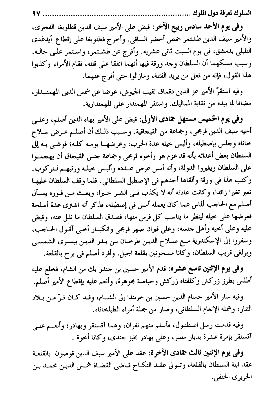 وَفِي يَوْم الْأَحَد سادس ربيع الآخر: قبض على الْأَمِير سيف الدّين قطلوبغا الْفَخر والأمير سيف الدّين طشتمر حمص أَخْضَر الساقي. وَأخرج قطلوبغا على إقطاع أيدغدي التليلي بِدِمَشْق فِي يَوْم السبت ثَانِي عشريه. وَأَفْرج عَن طشتمر وَاسْتمرّ على حَاله. وَسبب مسكهما أَن السُّلْطَان وجد ورقة فِيهَا أَنَّهُمَا اتفقَا على قَتله فَقَامَ الْأُمَرَاء وكذبوا هَذَا القَوْل فَإِنَّهُ من فعل من يُرِيد الْفِتْنَة ومازالوا حَتَّى أفرج عَنْهُمَا. وَفِيه اسْتَقر الْأَمِير عز الدّين دقماق نقيب الجيوش عوضا عَن شمس الدّين المهمندار مُضَافا لما بِيَدِهِ من نقابة المماليك. وَاسْتقر المهمندار على المهمندارية. وَفِي يَوْم الْخَمِيس مستهل جُمَادَى الأولى: قبض على الْأَمِير بهاء الدّين أصلم وعَلى أَخِيه سيف الدّين قرمجي وَجَمَاعَة من القبجاقية. وَسبب ذَلِك أَن أصلم عرض سلَاح خاناه وَجلسَ بإصطبله وألبس خيله عدَّة الْحَرْب وعرضها يَوْمه كُله فوشي بِهِ إِلَى السُّلْطَان بعض أعدائه بِأَنَّهُ قد عزم هُوَ وَأَخُوهُ قرمجي وَجَمَاعَة جنس القبجاق أَن يهجموا على السُّلْطَان ويغيروا الدولة وَأَنه أمس عرض عدده وألبس خيله ورتبهم للرُّكُوب. وَكتب هَذَا فِي ورقة وَأَلْقَاهَا أحدهم فِي الإصطبل السلطاني. فَلَمَّا وقف السُّلْطَان عَلَيْهَا تغير تغيراً زَائِدا وَكَانَت عَادَته أَنه لَا يكذب فِي الشَّرّ خَبرا وَبعث من فوره يسْأَل أصلم مَعَ الْحَاجِب ألماس عَمَّا كَانَ يعمله أمس فِي إصطبله فَذكر أَنه اشْترى عدَّة أسلحة فعرضها على خيله لينْظر مَا يُنَاسب كل فرس مِنْهَا فَصدق السُّلْطَان مَا نقل عَنهُ وَقبض عَلَيْهِ وعَلى أَخِيه وَأهل جنسه وعَلى قيران صهر قرمجي وانكبار أخي آقول الحاحب وسفروا إِلَى الْإسْكَنْدَريَّة مَعَ صَلَاح الدّين طرخان بن بدر الدّين بيسري الشمسي وبرلغي قريب السُّلْطَان وَكَانَا مسجونين بقلعة الْجَبَل. وأفرد أصلم فِي برج بالقلعة. وَفِي يَوْم الْإِثْنَيْنِ تَاسِع عشره: قدم الْأَمِير حُسَيْن بن جندر بك من الشَّام فَخلع عَلَيْهِ أطلس بطرز زركش وكلفتاه زرك! ش وحياصة مجوهرة وأنعم عَلَيْهِ بإقطاع الْأَمِير أصلم. وَفِيه سَار الْأَمِير حسام الدّين حُسَيْن بن خربندا إِلَى الشَّام وَقد كَانَ فر من بِلَاد التتار وشمله الإنعام السلطاني وَصَارَ من جملَة أُمَرَاء الطبلخاناه. وَفِيه قدمت رسل اصطنبول فَأسلم مِنْهُم نفران وهما آقسنقر وبهادر وأنعم على آقسنقر بإمرة عشرَة بديار مصر وعَلى بهادر بِخبْز جند وَكَانَا أخوة. وَفِي يَوْم الْإِثْنَيْنِ ثَالِث جُمَادَى الْآخِرَة: عقد على الْأَمِير سيف الدّين قوصون بالقلعة عقد ابْنة السُّلْطَان بالقلعة وَتَوَلَّى عقد النِّكَاح قَاضِي الْقُضَاة شمس الدّين مُحَمَّد بن الحريري الْحَنَفِيّ.