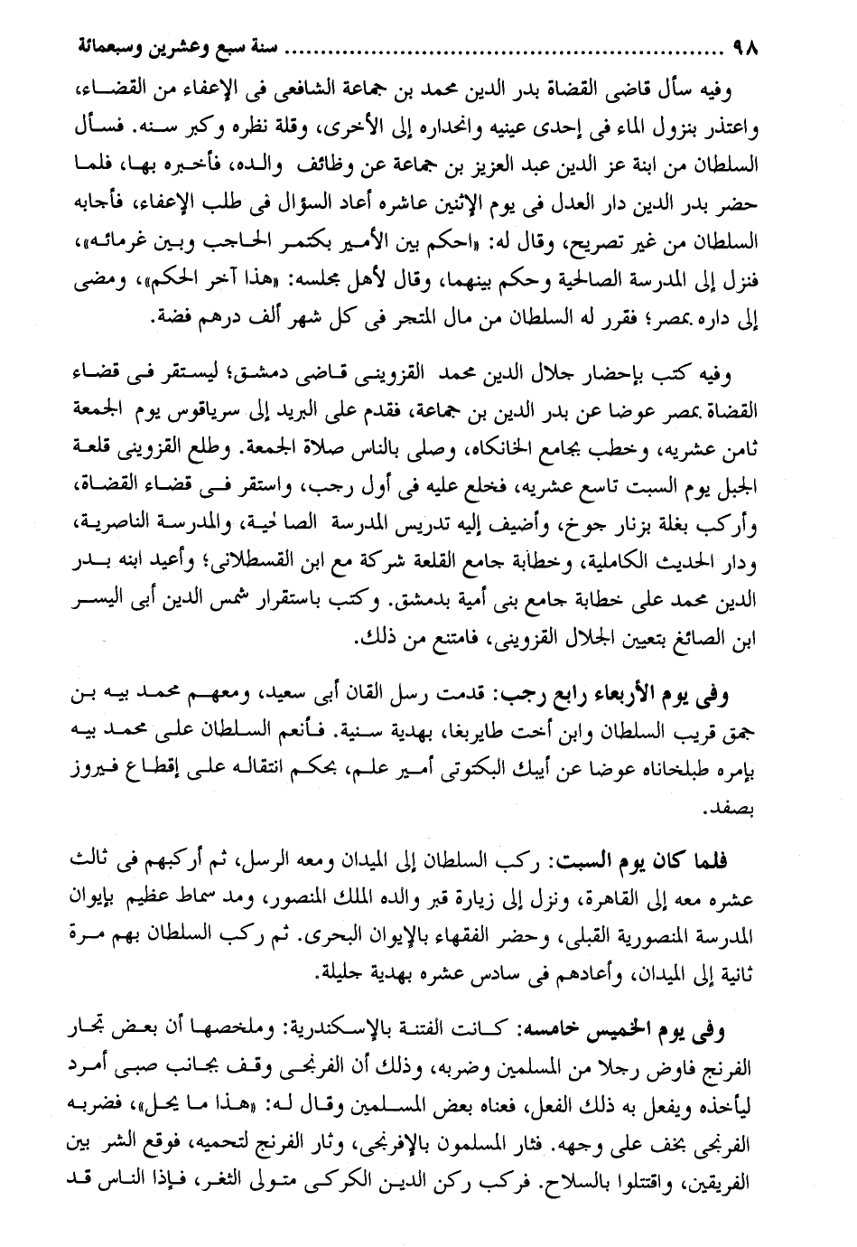 وَفِيه سَأَلَ قَاضِي الْقُضَاة بدر الدّين مُحَمَّد بن جمَاعَة الشَّافِعِي فِي الإعفاء من الْقَضَاء وَاعْتذر بنزول المَاء فِي إِحْدَى عَيْنَيْهِ وانحداره إِلَى الْأُخَر وَقلة نظره وَكبر سنه. فَسَأَلَ السُّلْطَان من ابْنة عز الدّين عبد الْعَزِيز بن جمَاعَة عَن وظائف وَالِده فَأخْبرهُ بهَا فَلَمَّا حضر بدر الدّين دَار الْعدْل فِي يَوْم الْإِثْنَيْنِ عاشره أعَاد السُّؤَال فِي طلب الإعفاء فَأَجَابَهُ السُّلْطَان من غير تَصْرِيح وَقَالَ لَهُ: احكم بَين الْأَمِير بكتمر الْحَاجِب وَبَين غُرَمَائه فَنزل إِلَى الْمدرسَة الصالحية وَحكم بَينهمَا وَقَالَ لأهل مَجْلِسه. هَذَا أخر الحكم وَمضى إِلَى دَاره بِمصْر فقرر لَهُ السُّلْطَان من مَال المتجر فِي كل شهر ألف دِرْهَم فضَّة. وَفِيه كتب بإحضار جلال الدّين مُحَمَّد الْقزْوِينِي قَاضِي دمشق ليستقر فِي قَضَاء الْقُضَاة بِمصْر عوضا عَن بدر الدّين بن جمَاعَة فَقدم على الْبَرِيد إِلَى سرياقوس يَوْم الْجُمُعَة ثامن عشريه وخطب بِجَامِع الخانكاه وَصلى بِالنَّاسِ صَلَاة الْجُمُعَة. وطلع الْقزْوِينِي قلعة الْجَبَل يَوْم السبت تَاسِع عشريه فَخلع عَلَيْهِ فِي أول رَجَب وَاسْتقر فِي قَضَاء الْقُضَاة وأركب بغلة بزنار جوخ وأضيف إِلَيْهِ تدريس الْمدرسَة الصالحية والمدرسة الناصرية وَدَار الحَدِيث الكاملية وخطابة جَامع القلعة شركَة مَعَ ابْن الْقُسْطَلَانِيّ وأعيد ابْنه بدر الدّين مُحَمَّد على خطابة جَامع بني أُميَّة بِدِمَشْق. وَكتب باستقرار شمس الدّين أبي الْيُسْر ابْن الصَّائِغ بِتَعْيِين الْجلَال القزوين فَامْتنعَ من ذَلِك. وَفِي يَوْم الْأَرْبَعَاء رَابِع رَجَب: قدمت رسل القان أبي سعيد وَمَعَهُمْ مُحَمَّد بيه بن جمق قريب السُّلْطَان وَابْن أُخْت طايربغا بهدية سنية. فأنعم السُّلْطَان على مُحَمَّد بيه بإمره طبلخاناه عوضا عَن أيبك البكتوتي أَمِير علم بِحكم انْتِقَاله على إقطاع فَيْرُوز بصمد. فَلَمَّا كمان يَوْم السبت: ركب السُّلْطَان إِلَى الميدان وَمَعَهُ الرُّسُل ثمَّ أركبهم فِي ثَالِث عشره مَعَه إِلَى الْقَاهِرَة وَنزل إِلَى زِيَارَة قبر وَالِده الْملك الْمَنْصُور وَمد سماط عَظِيم بإيوان الْمدرسَة المنصورية القبلي وَحضر الْفُقَهَاء بالإيوان البحري. ثمَّ ركب السُّلْطَان بهم مرّة ثَانِيَة إِلَى الميدان وأعادهم فِي سادس عشره بهدية جليلة. وَفِي يَوْم الْخَمِيس خامسه: كَانَت الْفِتْنَة بالإسكندرية: وملخصها أَن بعض تجار الفرنج فاوض رجلا من الْمُسلمين وضربه وَذَلِكَ أَن الفرنجي وقف بِجَانِب صبي أَمْرَد ليأخذه وَيفْعل بِهِ ذَلِك الْفِعْل فعناه بعض الْمُسلمين وَقَالَ لَهُ: هَذَا مَا يحل فَضَربهُ الفرنجي بخف على وَجهه. فثار الْمُسلمُونَ بالإفرنج وثار الفرنج لتحميه فَوَقع الشَّرّ بَين الْفَرِيقَيْنِ واقتتلوا بِالسِّلَاحِ. فَركب ركن الدّين الكركي مُتَوَلِّي الثغر فَإِذا النَّاس قد