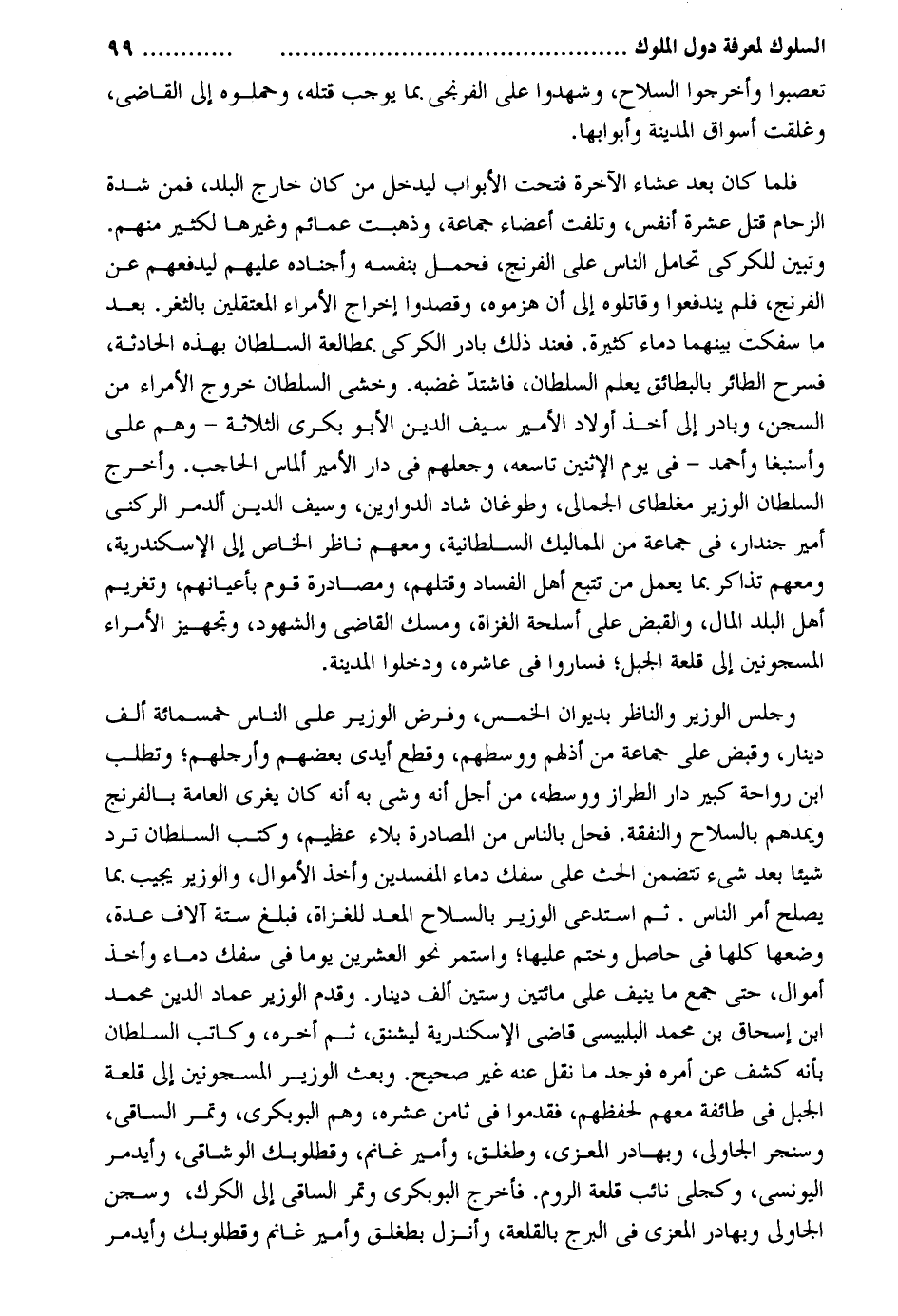 ئعصبوا وأخرجوا السِّلَاح وشهدوا على الفرنجي. مِمَّا يُوجب قَتله وَحَمَلُوهُ إِلَى القَاضِي وغلقت أسواق الْمَدِينَة وأبوابها. فَلَمَّا كَانَ بعد عشَاء الْآخِرَة فتحت الْأَبْوَاب ليدحل من كَانَ خَارج الْبَلَد فَمن شدَّة الزحام قتل عشرَة أنفس وَتَلفت أَعْضَاء جمَاعَة وَذَهَبت عمائم وَغَيرهَا لكثير مِنْهُم. وَتبين للكركي تحامل النَّاس على الفرنج فَحمل بِنَفسِهِ وأجناده عَلَيْهِم ليدفعهم عَن الفرنج فَلم يندفعوا وقاتلوه إِلَى أَن هزموه وقصدوا إِخْرَاج الْأُمَرَاء المعتقلين بالثغر. بعد مَا سفكت بَينهمَا دِمَاء كَثِيرَة. فَعِنْدَ ذَلِك بَادر الكركي بمطالعة السُّلْطَان بِهَذِهِ الْحَادِثَة فسرح الطَّائِر بالبطائق يعلم السُّلْطَان فَاشْتَدَّ غَضَبه. وخشي السُّلْطَان خُرُوج الْأُمَرَاء من السجْن وبادر إِلَى أَخذ أَوْلَاد الْأَمِير سيف الدّين الأبو بكري الثَّلَاثَة - وهم على وأسنبغا وَأحمد - فِي يَوْم الْإِثْنَيْنِ تاسعه وجعلهم فِي دَار الْأَمِير ألماس الْحَاجِب. وَأخرج السُّلْطَان الْوَزير مغلطاي الْجمال وطوغان شاد الدَّوَاوِين وَسيف الدّين ألدمر الركني أَمِير جندار فِي جمَاعَة من المماليك السُّلْطَانِيَّة وَمَعَهُمْ نَاظر الْخَاص إِلَى الْإسْكَنْدَريَّة وَمَعَهُمْ تَذَاكر. مِمَّا يعْمل من تتبع أهل الْفساد وقتلهم ومصادرة قوم بأعيانهم وتغريم أهل الْبَلَد المَال وَالْقَبْض على أسلحة الْغُزَاة ومسك القَاضِي وَالشُّهُود وتجهيز الْأُمَرَاء المسجونين إِلَى قلعة الْجَبَل فَسَارُوا فِي عاشره ودخلوا الْمَدِينَة. وَجلسَ الْوَزير والناظر بديوان الْخمس وَفرض الْوَزير على النَّاس خَمْسمِائَة ألف دِينَار وَقبض على جمَاعَة من أذلّهم ووسطهم وَقطع أَيدي بَعضهم وأرجلهم وتطلب ابْن رَوَاحَة كَبِير دَار الطّراز ووسطه من أجل أَنه وشي بِهِ أَنه كَانَ يغري الْعَامَّة بالفرنج ويمدهم بِالسِّلَاحِ وَالنَّفقَة. فَحل بِالنَّاسِ من المصادرة بلَاء عَظِيم وَكتب السُّلْطَان ترد شَيْئا بعد شَيْء تَتَضَمَّن الْحَث على سفك دِمَاء المفسدين وَأخذ الْأَمْوَال والوزير يُجيب بِمَا يصلح أَمر النَّاس. ثمَّ استدعى الْوَزير بِالسِّلَاحِ الْمعد للغزاة فَبلغ سِتَّة أُلَّاف عدَّة وَضعهَا كلهَا فِي حَاصِل وَختم عَلَيْهَا وَاسْتمرّ نَحْو الْعشْرين يَوْمًا فِي سفك دِمَاء وَأخذ أَمْوَال حَتَّى جمع مَا ينيف على مِائَتَيْنِ وَسِتِّينَ ألف دِينَار وَقدم الْوَزير عماد الدّين مُحَمَّد ابْن اسحاق بن مُحَمَّد البلبيسي قَاضِي الْإسْكَنْدَريَّة ليشنق ثمَّ أَخّرهُ وَكَاتب السُّلْطَان بِأَنَّهُ كشف عَن أمره فَوجدَ مَا نقل عَنهُ غير صَحِيح. وَبعث الْوَزير المسجونين إِلَى قلعة الْجَبَل فِي طَائِفَة مَعَهم لحفظهم فقدموا فِي ثامن عشره وهم البوبكري وتمر الساقي وسنجر الجاولي وبهادر الْمعز وطغلق وأمير غَانِم وقطلوبك الوشاقي وأيدمر اليونسي وكجلي نَائِب قلعة الرّوم. فَأخْرج البوبكري وتمر الساقي إِلَى الكرك وسجن الجاولي وبهادر المعزي فِي البرج بالقلعة وَأنزل بطغلق وأمير غَانِم وقطلوبك وأيدمر
