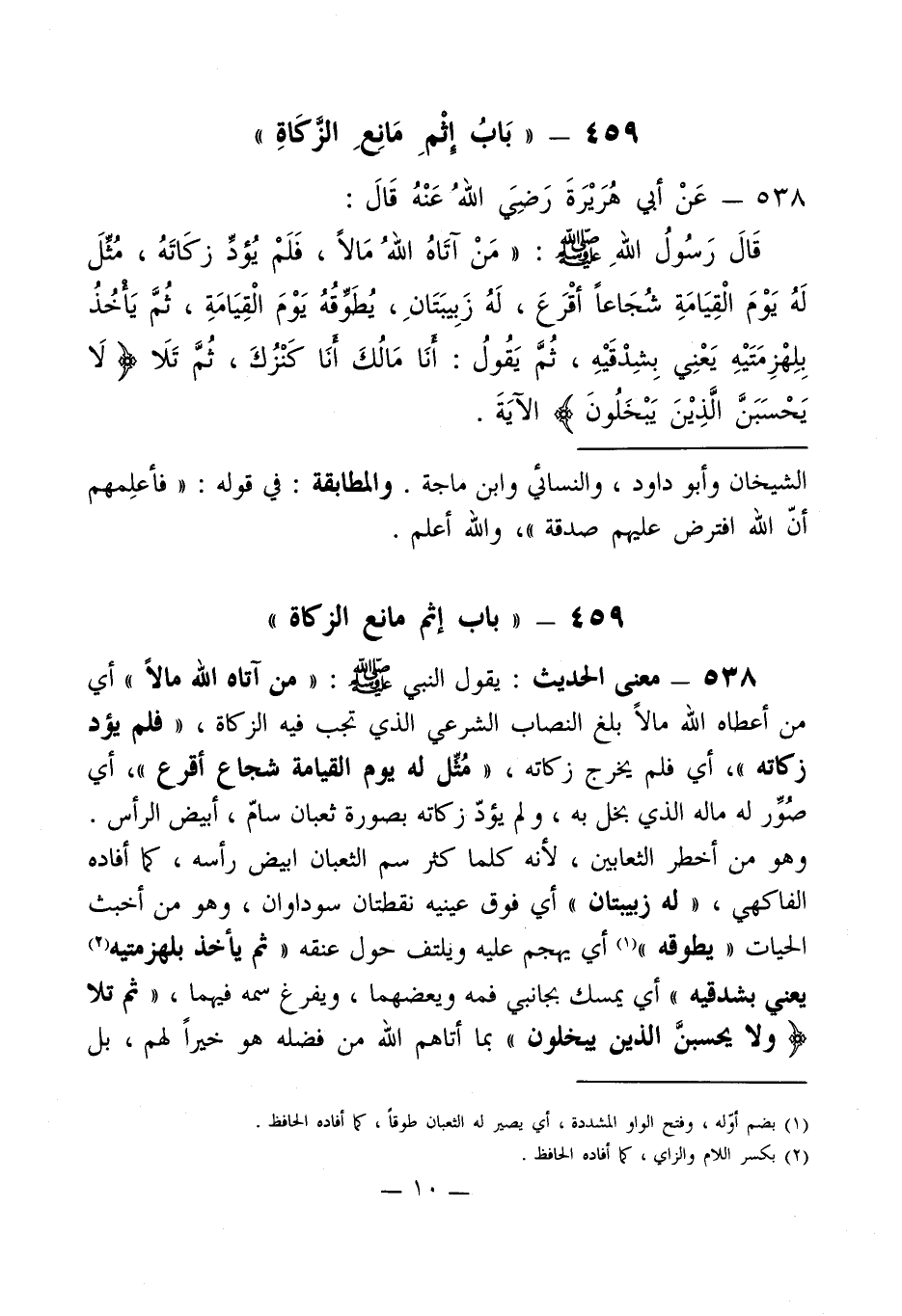538 - معنى الحديث: يقول النبي - صلى الله عليه وسلم -: " من آتاه الله مالاً " أي من أعطاه الله مالاً بلغ النصاب الشرعي الذي تجب فيه الزكاة، " فلم يؤد زكاته "، أي فلم يخرج زكاته، " مُثل له يوم القيامة شجاع أقرع "، أي صُوِّر له ماله الذي بخل به، ولم يؤدّ زكاته بصورة ثعبان سامّ، أبيض الرأس.