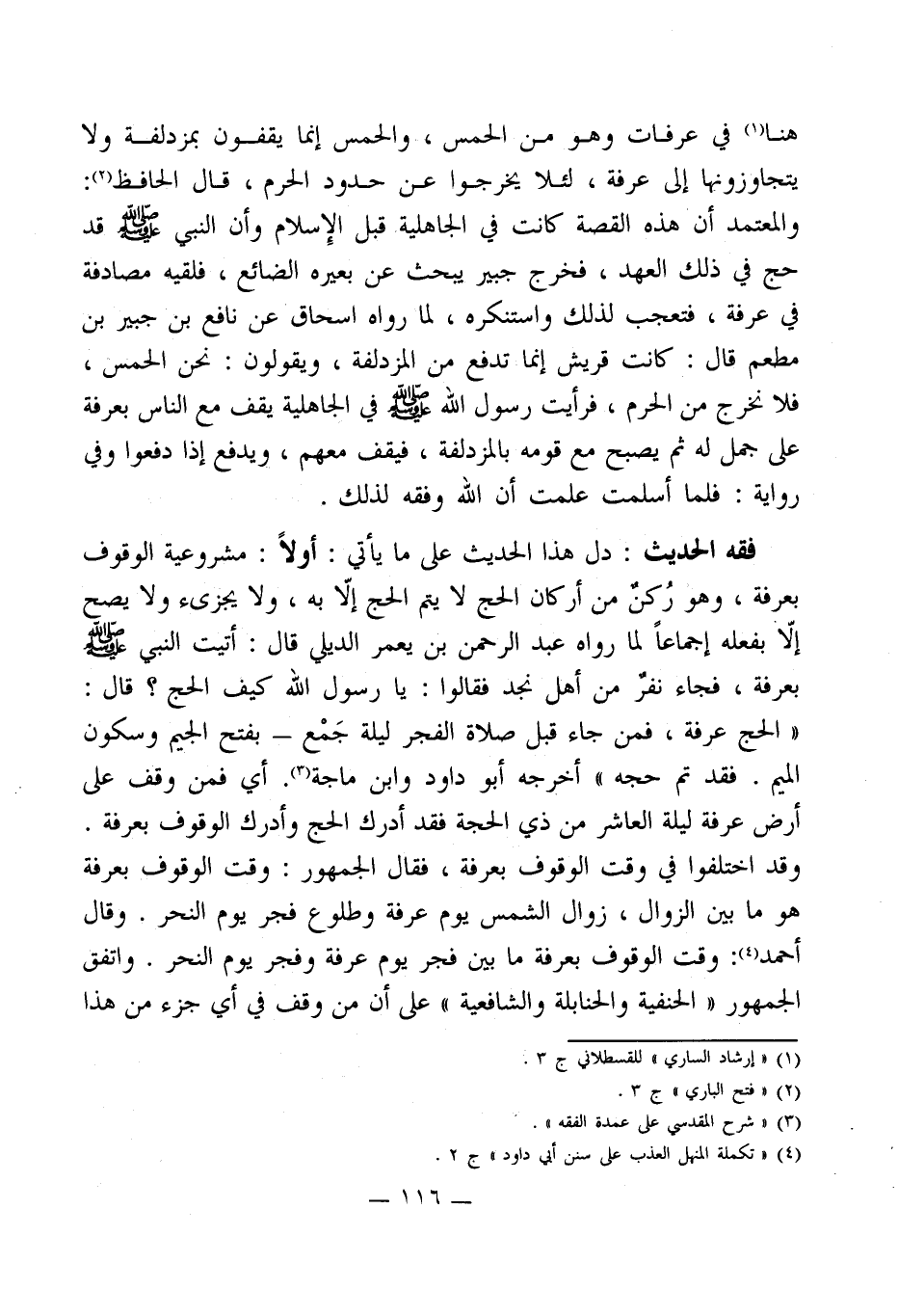 فقه الحديث: دل هذا الحديث على ما يأتي: أولاً: مشروعية الوقوف بعرفة، وهو رُكن من أركان الحج لا يتم الحج إلاّ به، ولا يجزىء ولا يصح إلّا بفعله إجماعاً لما رواه عبد الرحمن بن يعمر الديلي قال: أتيت النبي - صلى الله عليه وسلم - بعرفة، فجاء نفر من أهل نجد فقالوا: يا رسول الله كيف الحج؟ قال: " الحج عرفة، فمن جاء قبل صلاة الفجر ليلة جَمْع - بفتح الجيم وسكون الميم. فقد تم حجه " أخرجه أبو داود وابن ماجة (¬3). أي فمن وقف على أرض عرفة ليلة العاشر من ذي الحجة فقد أدرك الحج وأدرك الوقوف بعرفة.