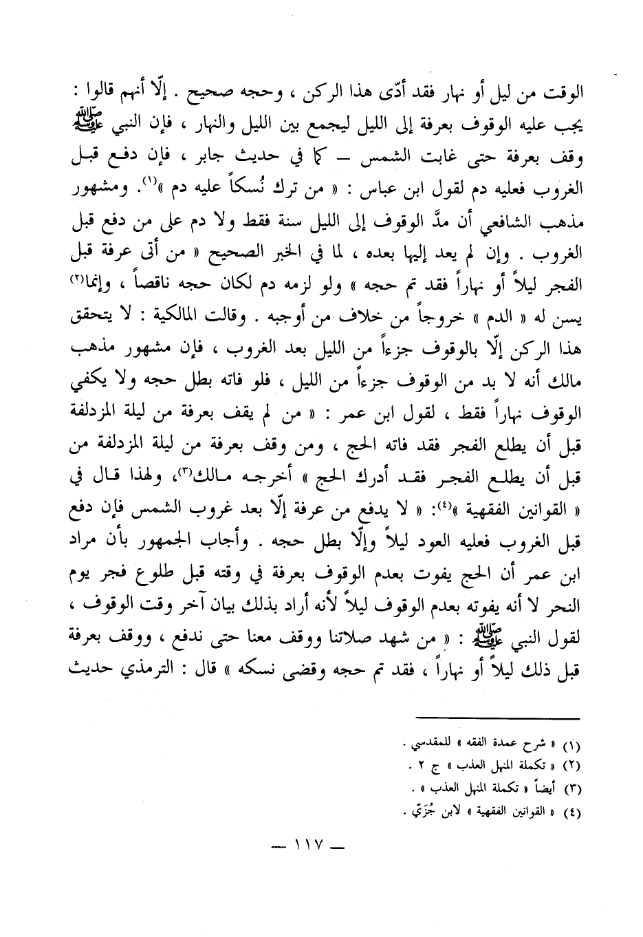 الوقت من ليل أو نهار فقد أدّى هذا الركن، وحجه صحيح. إلاّ أنهم قالوا: يجب عليه الوقوف بعرفة إلى الليل ليجمع بين الليل والنهار، فإن النَّبِيُّ - صلى الله عليه وسلم - وقف بعرفة حتى غابت الشمس - كما في حديث جابر، فإن دفع قبل الغروب فعليه دم لقول ابن عباس: " من ترك نُسكاً عليه دم " (¬1). ومشهور مذهب الشافعي أن مدَّ الوقوف إلى الليل سنة فقط ولا دم على من دفع قبل الغروب. وإن لم يعد إليها بعده، لما في الخبر الصحيح " من أَتى عرفة قبل الفجر ليلاً أو نهاراً فقد تم حجه " ولو لزمه دم لكان حجه ناقصاً، وإنما (¬2) يسن له " الدم " خروجاً من خلاف من أوجبه. وقالت المالكية: لا يتحقق هذا الركن إلاّ بالوقوف جزءاً من الليل بعد الغروب، فإن مشهور مذهب مالك أنه لا بد من الوقوف جزءاً من الليل، فلو فاته بطل حجه ولا يكفي الوقوف نهاراً فقط، لقول ابن عمر: " من لم يقف بعرفة من ليلة المزدلفة قبل أن يطلع الفجر فقد فاته الحج، ومن وقف بعرفة من ليلة المزدلفة من قبل أن يطلع الفجر فقد أدرك الحج " أخرجه مالك (¬3)، ولهذا قال في " القوانين الفقهية " (¬4): " لا يدفع من عرفة إلاّ بعد غروب الشمس فإن دفع قبل الغروب فعليه العود ليلاً وإلّا بطل حجه. وأجاب الجمهور بأن مراد ابن عمر أن الحج يفوت بعدكم الوقوف بعرفة في وقته قبل طلوع فجر يوم النحر لا أنه يفوته بعدم الوقوف ليلاً لأنه أراد بذلك بيان آخر وقت الوقوف، لقول النَّبِيُّ - صلى الله عليه وسلم -: " من شهد صلاتنا ووقف معنا حتى ندفع، ووقف بعرفة قبل ذلك ليلاً أو نهاراً، فقد تم حجه وقضى نسكه " قال: الترمذي حديث