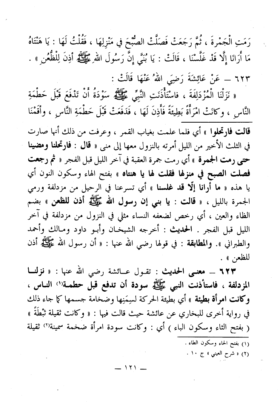 623 - معنى الحديث: تقول عائشة رضي الله عنها: " نزلنا المزدلفة، فاستأذنت النبي - صلى الله عليه وسلم - سودة أن تدفع قبل حطمة (¬1) الناس، وكانت امرأة بطيئة " أي بطيئة الحركة لسِمَنِها وضخامة جسمها كما جاء ذلك في رواية أخرى للبخاري عن عائشة حيث قالت فيها: " وكانت ثقيلة ثبْطَةً " (بفتح الثاء وسكون الباء) أي: وكانت سودة امرأة ضخمة سمينة (¬2) ثقيلة