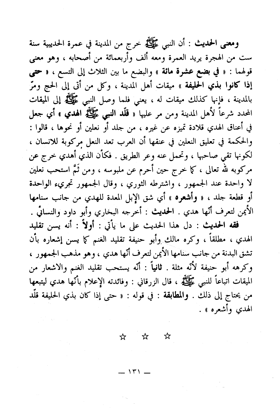 ومعنى الحديث: أن النَّبِيَّ - صلى الله عليه وسلم - خرج من المدينة في عمرة الحديبية سنة ست من الهجرة يريد العمرة ومعه ألف وأربعمائة من أصحابه، وهو معنى قولهما: " في بضع عشرة مائة " والبضع ما بين الثلاث إلى التسع، " حتى إذا كانوا بذي الحليفة " ميقات أهل المدينة، وكل من أتى إلى الحج ومرّ بالمدينة، فإنها كذلك ميقات له، يعني فلما وصل النَّبِيَّ - صلى الله عليه وسلم - إلى الميقات المحدد شرعاً لأهل المدينة ومن مر عليها " قلّد النبي - صلى الله عليه وسلم - الهدي " أي جعل في أعناق الهدي قلادة تميزه عن غيره، من جلد أو نعلين أو نحوها، قالوا: والحكمة في تعليق النعلين في عنقها أن العرب تعد النعل مركوبة للإنسان، لكونها تقي صاحبها، وتحمل عنه وعر الطريق. فكأن الذي أهدي خرج عن مركوبه لله تعالى، كما خرج حين أحرم عن ملبوسه، ومن ثَمَّ استحب نعلين لا واحدة عند الجمهور، واشترطه الثوري، وقال الجمهور تجريء الواحدة أو قطعة جلد، " وأشعره " أي شق الإبل المعدة للهدي من جانب سنامها الأيمن لتعرف أنها هدي. الحديث: أخرجه البخاري وأبو داود والنسائي.