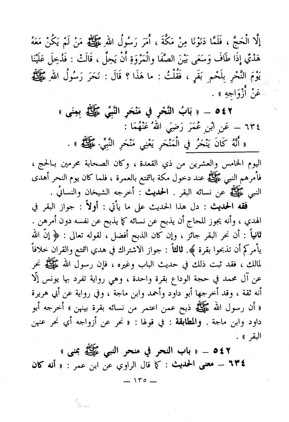 ثانياًً: أن نحر البقر جائز، وإن كان الذبح أفضل، لقوله تعالى: (إِنَّ اللَّهَ يَأْمُرُكُمْ أَنْ تَذْبَحُوا بَقَرَةً). ثالثاً: جواز الاشتراك في هدي التمتع والقران خلافاً لمالك، فقد ثبت ذلك في حديث الباب وغيره، فإن رسول الله - صلى الله عليه وسلم - نحر عن آل محمد في حجة الوداع بقرة واحدة، وهي رواية تفرد بها يونس إلّا أنه ثقة، وقد أخرجها أبو داود وأحمد وابن ماجة، وفي رواية عن أبي هريرة " أن رسول الله - صلى الله عليه وسلم - ذبح عمن اعتمر من نسائه بقرة بينهن " أخرجه أبو داود وابن ماجة. والمطابقة: في قولها: " نحر عن أزواجه أي نحر عنهن البقر ".