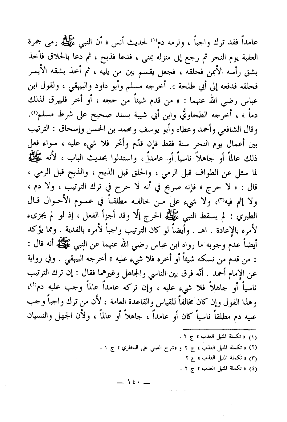 وقال الشافعي وأحمد وعطاء وأبو يوسف ومحمد بن الحسن وإسحاق: الترتيب بين أعمال يوم النحر سنة فقط فإن قدّم وأخّر فلا شيء عليه، سواء فعل ذلك عالماً أو جاهلاً ناسياً أو عامداً، واستدلوا بحديث الباب، لأنه - صلى الله عليه وسلم - لما سئل عن الطواف قبل الرمي، والحلق قبل الذبح، والذبح قبل الرمي، قال: " لا حرج " فإنه صريح في أنه لا حرج في ترك الترتيب، ولا دم، ولا إثم فيه (¬3)، ولا شيء على من خالفه مطلقاً في عموم الأحوال قال الطبري: لم يسقط النبي - صلى الله عليه وسلم - الحرج إلاّ وقد أجزأ الفعل، إذ لو لم يجزىء لأمره بالإعادة. اهـ. وأيضاًً لو كان الترتيب واجباً لأمره بالفدية. ومما يؤكد أيضاًً عدم وجوبه ما رواه ابن عباس رضي الله عنهما عن النبي - صلى الله عليه وسلم - أنه قال: " من قدم من نسكه شيئاً أو أخره فلا شيء عليه " أخرجه البيهقي. وفي رواية عن الإِمام أحمد. أنّه فرق بين الناسي والجاهل وغيرهما فقال: إن ترك الترتيب ناسياً أو جاهلاً فلا شيء عليه، وإن تركه عامداً عالماً وجب عليه دم (¬4)، وهذا القول وإن كان مخالفاً للقياس والقاعدة العامة، لأن من ترك واجباً وجب عليه دم مطلقاً ناسياً كان أو عامداً، جاهلاً أو عالماً، ولأن الجهل والنسيان