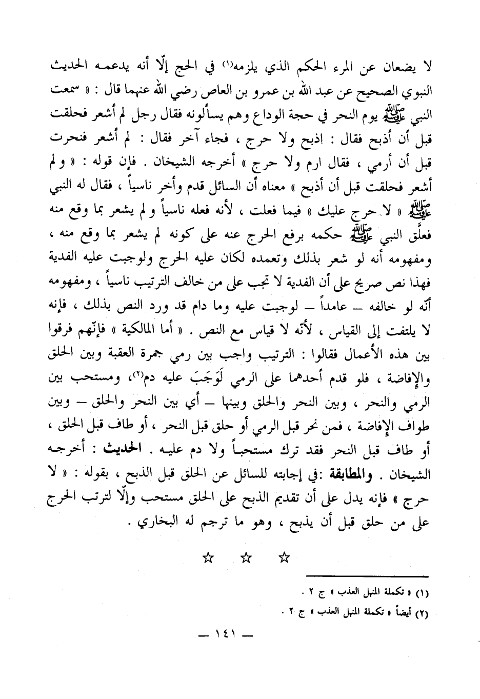 لا يضعان عن المرء الحكم الذي يلزمه (¬1) في الحج إلاّ أنه يدعمه الحديث النبوي الصحيح عن عبد الله بن عمرو بن العاص رضي الله عنهما قال: " سمعت النَّبِيَّ - صلى الله عليه وسلم - يوم النحر في حجة الوداع وهم يسألونه فقال رجل لم أشعر فحلقت قبل أن أذبح فقال: اذبح ولا حرج، فجاء آخر فقال: لم أشعر فنحرت قبل أن أرمي، فقال ارم ولا حرج " أخرجه الشيخان. فإن قوله: " ولم أشعر فحلقت قبل أن أذبح " معناه أن السائل قدم وأخر ناسياً، فقال له النبي - صلى الله عليه وسلم - " لا حرج عليك " فيما فعلت، لأنه فعله ناسياً ولم يشعر بما وقع منه فعلَّق النبي - صلى الله عليه وسلم - حكمه برفع الحرج عنه على كونه لم يشعر بما وقع منه، ومفهومه أنه لو شعر بذلك وتعمده لكان عليه الحرج ولو جبت عليه الفدية فهذا نص صريح على أن الفدية لا تجب على من خالف الترتيب ناسياً، ومفهومه أنّه لو خالفه -عامداً- لوجبت عليه وما دام قد ورد النص بذلك، فإنه لا يلتفت إلى القياس، لأنّه لا قياس مع النص. " أما المالكية " فإنّهم فرقوا بين هذه الأعمال فقالوا: الترتيب واجب بين رمي جمرة العقبة وبين الحلق والإِفاضة، فلو قدم أحدهما على الرمي لَوَجَبَ عليه دم (¬2)، ومستحب بين الرمي والنحر، وبين النحر والحلق وبينها -أي بين النحر والحلق- وبين طواف الإفاضة، فمن نحر قبل الرمي أو حلق قبل النحر، أو طاف قبل الحلق، أو طاف قبل النحر فقد ترك مستحباً ولا دم عليه. الحديث: أخرجه الشيخان. والمطابقة: في إجابته للسائل عن الحلق قبل الذبح، بقوله: " لا حرج " فإنه يدل على أن تقديم الذبح على الحلق مستحب وإلّا لترتب الحرج على من حلق قبل أن يذبح، وهو ما ترجم له البخاري.