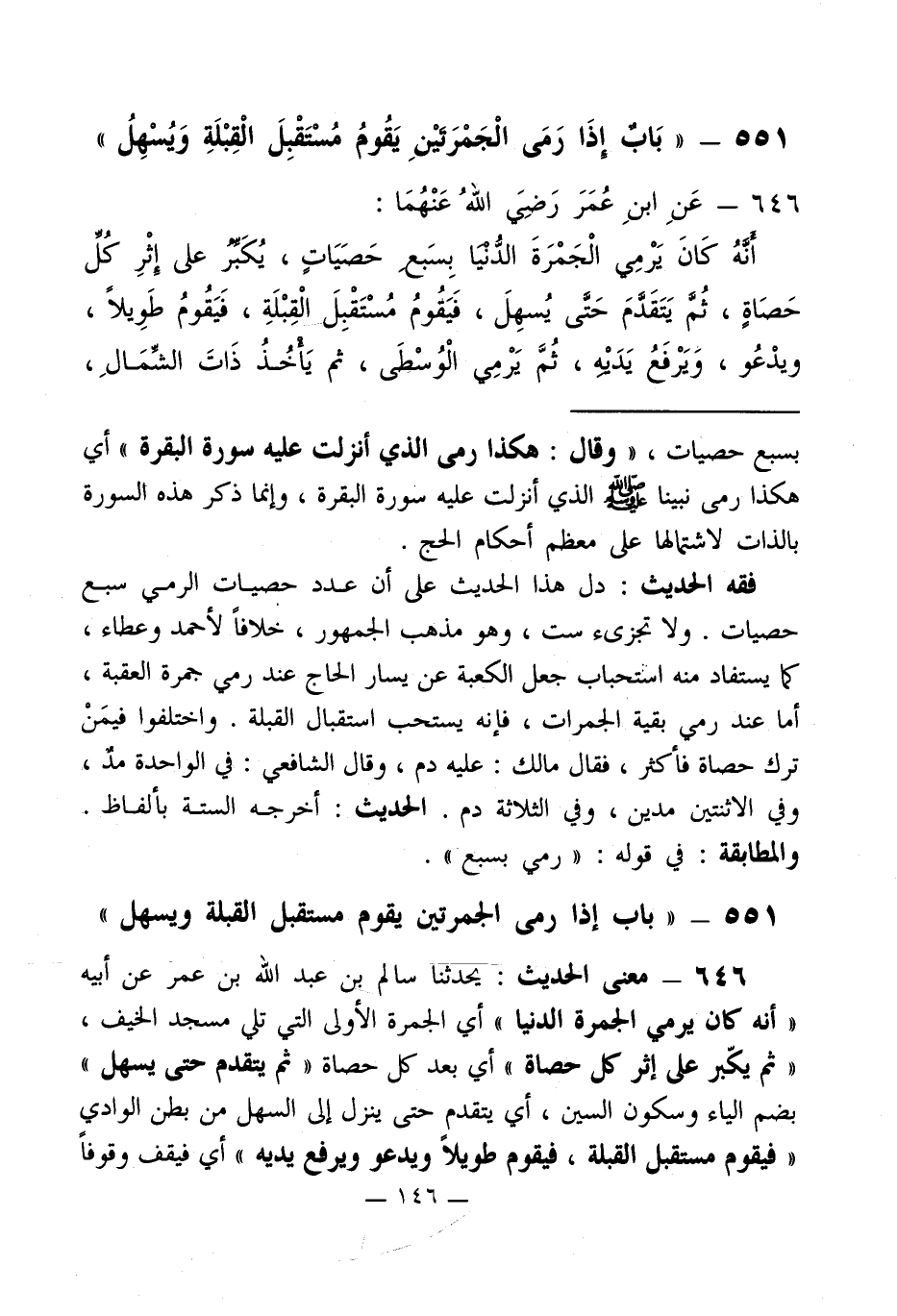 551 - " بَابُ إذَا رَمَى الْجَمْرَتيْنِ يَقُومُ مُسْتقْبِلَ الْقِبْلَةِ وَيُسْهِلُ "