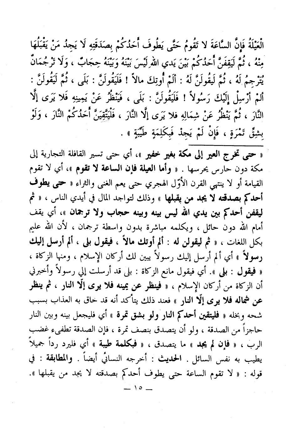 " حتى تخرج العير إلى مكة بغير خفير "، أي حتى تسير القافلة التجارية إلى مكة دون حارس يحرسها. " وأما العيلة فإن الساعة لا تقوم "، أي لا تقوم القيامة أو لا ينتهي القرن الأوّل الهجري حتى يعم الغنى والثراء " حتى يطوف أحدكم بصدقته لا يجد من يقبلها " وذلك لتواجد المال في أيدي الناس، " ثم ليقفن أحدكم بين يدى الله ليس بينه وبينه حجاب ولا ترجمان "، أي يقف أمام الله دون حائل، ويكلمه مباشرة بدون واسطة ترجمان، لأن الله عليم بكل اللغات، " ثم ليقولن له: ألم أوتك مالاً، فيقول بلى، ألم أرسل إليك رسولاً " أي ألم أرسل إليك رسولاً يبين لك أركان الإِسلام، ومنها الزكاة، " فيقول: بلى ". أي فيقول مانع الزكاة: بلى قد أرسلت إلي رسولاً وأخبرني أن الزكاة من أركان الإِسلام، " فينظر عن يمينه فلا يرى إلاّ النار، ثم ينظر عن شماله فلا يرى إلاّ النار " فعند ذلك يتأكد أنه قد حاق به العذاب بسبب شحه وبخله " فليتقين أحدكم النار ولو بشق تمرة " أي فليجعل بينه وبين النار حاجزاً من الصدقة، ولو أن يتصدق بنصف تمرة، فإن الصدقة تطفىء غضب الرب، " فإن لم يجد " ما يتصدق، " فبكلمة طيبة " أي فليرد رداً جميلاً يطيب به نفس السائل. الحديث: أخرجه النسائي أيضاً. والمطابقة: في قوله: " لا تقوم الساعة حتى يطوف أحدكم بصدقته لا يجد من يقبلها ".