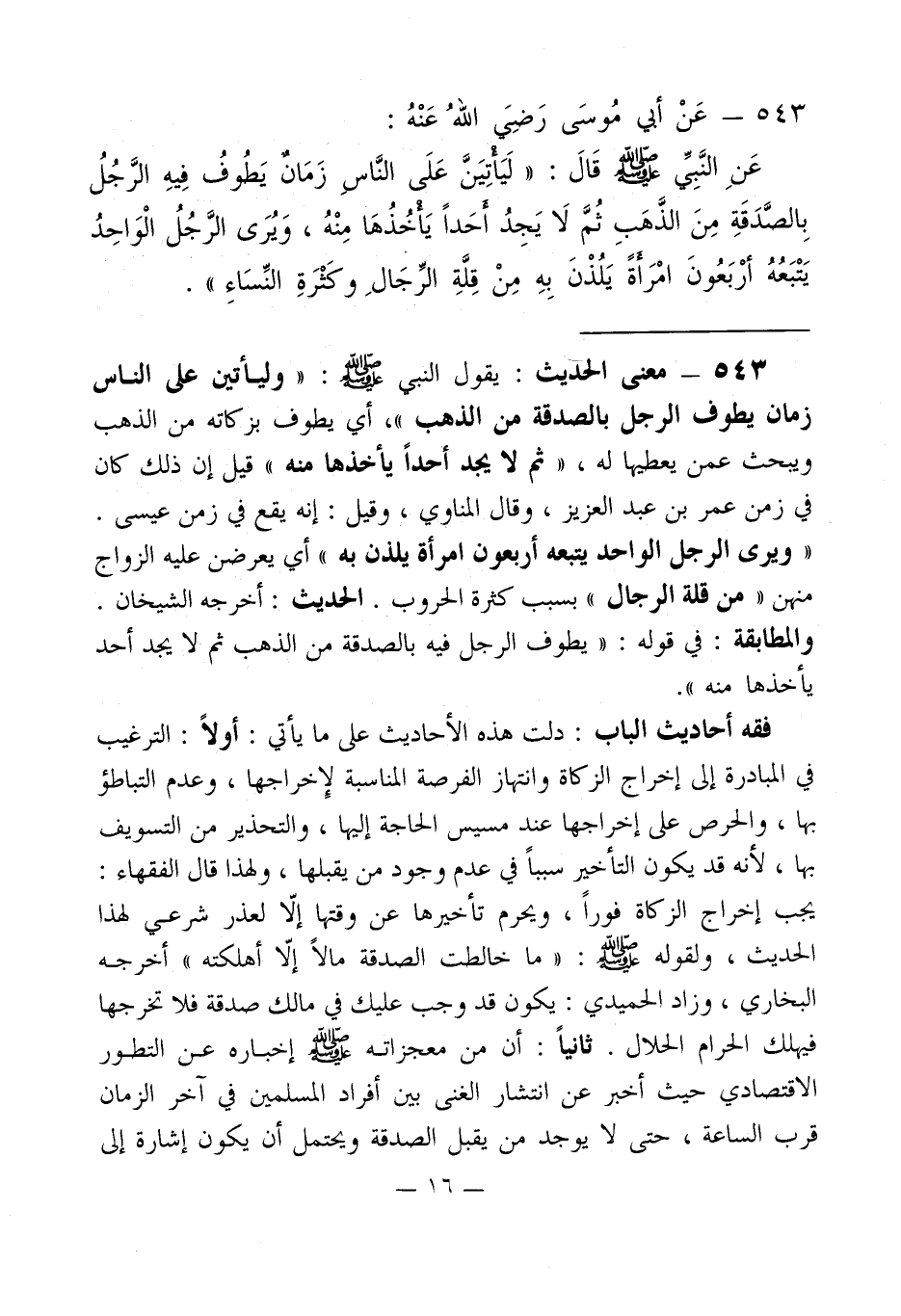 543 - معنى الحديث: يقول النبي - صلى الله عليه وسلم -: " وليأتين على الناس زمان يطوف الرجل بالصدقة من الذهب "، أي يطوف بزكاته من الذهب ويبحث عمن يعطيها له، " ثم لا يجد أحداً يأخذها منه " قيل إن ذلك كان في زمن عمر بن عبد العزيز، وقال المناوي، وقيل: إنه يقع في زمن عيسى.