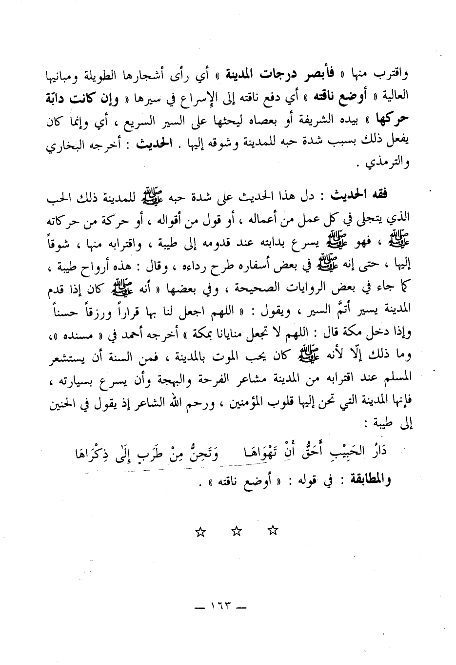 فقه الحديث: دل هذا الحديث على شدة حبه - صلى الله عليه وسلم - للمدينة ذلك الحب الذي يتجلى في كل عمل من أعماله، أو قول من أقواله، أو حركة من حركاته - صلى الله عليه وسلم -، فهو - صلى الله عليه وسلم - يسرع بدابته عند قدومه إلى طيبة، واقترابه منها، شوقاً إليها، حتى إنه - صلى الله عليه وسلم - في بعض أسفاره طرح رداءه، وقال: هذه أرواح طيبة، كما جاء في بعض الروايات الصحيحة، وفي بعضها " أنه - صلى الله عليه وسلم - كان إذا قدم المدينة يسير أتمَّ السير، ويقول: " اللهم اجعل لنا بها قراراً ورزقاً حسناً وإذا دخل مكة قال: اللهم لا تجعل منايانا بمكة " أخرجه أحمد في " مسنده "، وما ذلك إلاّ لأنه - صلى الله عليه وسلم - كان يحب الموت بالمدينة، فمن السنة أن يستشعر المسلم عند اقترابه من المدينة مشاعر الفرحة والبهجة وأن يسرع بسيارته، فإنها المدينة التي تحن إليها قلوب المؤمنين، ورحم الله الشاعر إذ يقول في الحنين إلى طيبة: