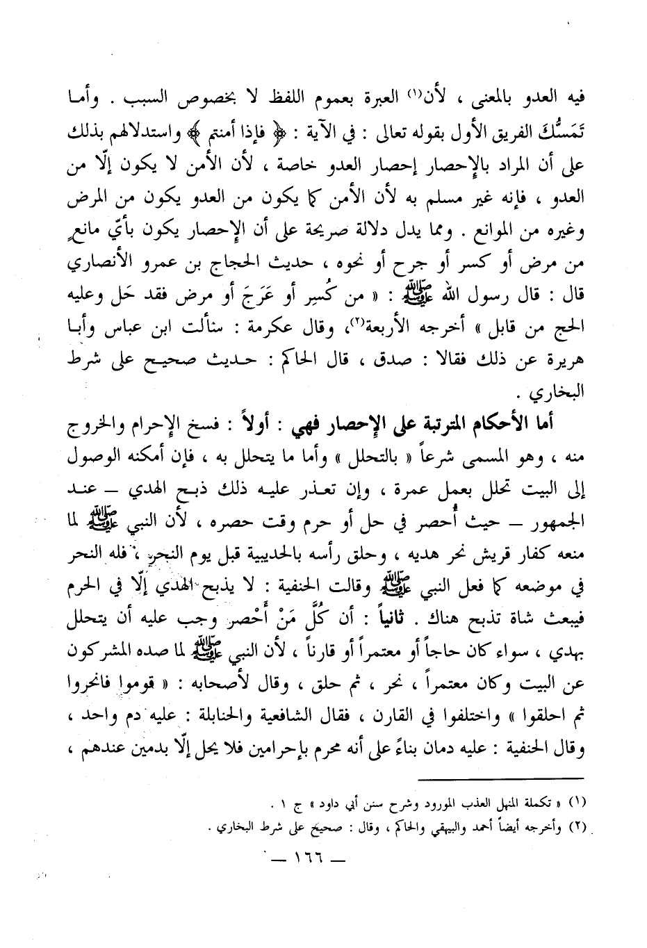 فيه العدو بالمعنى، لأن (¬1) العبرة بعموم اللفظ لا بخصوص السبب. وأما تَمَسُّكَ الفريق الأول بقوله تعالى: في الآية: (فَإِذَا أَمِنْتُمْ) واستدلالهم بذلك على أن المراد بالإِحصار إحصار العدو خاصة، لأن الأمن لا يكون إلاّ من العدو، فإنه غير مسلم به لأن الأمن كما يكون من العدو يكون من المرض وغيره من الموانع. ومما يدل دلالة صريحة على أن الإِحصار يكون بأيّ مانع من مرض أو كسر أو جرح أو نحوه، حديث الحجاج بن عمرو الأنصاري قال: قال رسول الله - صلى الله عليه وسلم -: " من كُسِر أو عَرَجَ أو مرض فقد حَل وعليه الحج من قابل " أخرجه الأربعة (¬2)، وقال عكرمة: سألت ابن عباس وأبا هريرة عن ذلك فقالا: صدق، قال الحاكم: حديث صحيح على شرط البخاري.