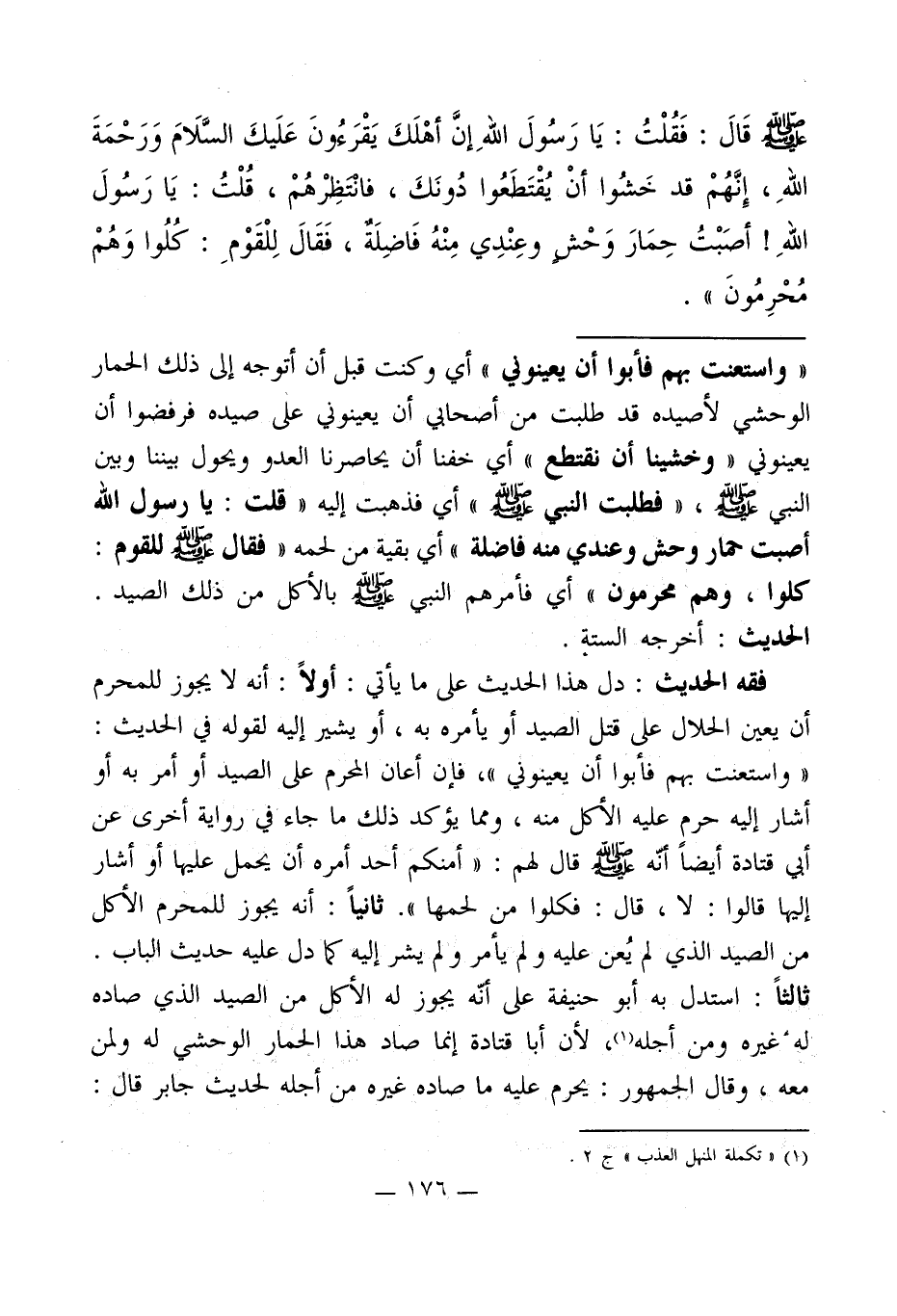 فقه الحديث: دل هذا الحديث على ما يأتي: أولاً: أنه لا يجوز للمحرم أن يعين الحلال على قتل الصيد أو يأمره به، أو يشير إليه لقوله في الحديث: " واستعنت بهم فأبوا أن يعينوني "، فإن أعان المحرم على الصيد أو أمر به أو أشار إليه حرم عليه الأكل منه، ومما يؤكد ذلك ما جاء في رواية أخرى عن أبي قتادة أيضاًً - صلى الله عليه وسلم - قال لهم: " أمنكم أحد أمره أن يحمل عليها أو أشار إليها قالوا: لا، قال: فكلوا من لحمها ". ثانياًً: أنه يجوز للمحرم الأكل من الصيد الذي لم يُعن عليه ولم يأمر ولم يشر إليه كما دل عليه حديث االباب.