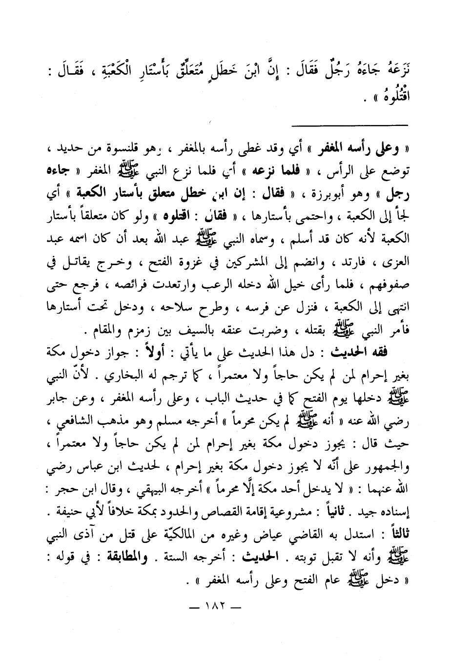 فقه الحديث: دل هذا الحديث على ما يأتي: أولاً: جواز دخول مكة بغير إحرام لمن لم يكن حاجاً ولا معتمراً، كما ترجم له البخاري. لأن النبي - صلى الله عليه وسلم - دخلها يوم الفتح كما في حديث الباب، وعلى رأسه المغفر، وعن جابر رضي الله عنه " أنه - صلى الله عليه وسلم - لم يكن محرماً " أخرجه مسلم وهو مذهب الشافعي، حيث قال: يجوز دخول مكة بغير إحرام لمن لم يكن حاجاً ولا معتمراً، والجمهور على أنّه لا يجوز دخول مكة بغير إحرام، لحديث ابن عباس رضي الله عنهما: " لا يدخل أحد مكة إلَّا محرماً " أخرجه البيهقي، وقال ابن حجر: إسناده جيد. ثانياًً: مشروعية إقامة القصاص والحدود بمكة خلافاً لأبي حنيفة.