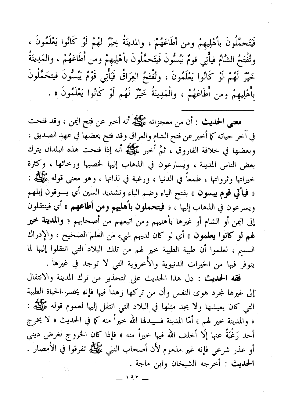 فَيَتَحمَّلُونَ بأهْلِيهِمْ ومن أطَاعَهُمْ، والمدينَةُ خِيْر لهُمْ لَوْ كَانُوا يَعْلَمُونَ، وتُفْتَحُ الشَّامُ فيأتِي قوم يَبُسُّونَ فَيتَحمَّلونَ بأهْلِيهِمْ ومن أطَاعَهُمْ، والمَدِينَةُ خَيْرٌ لَهُمْ لَوْ كَانُوا يَعْلَمُونَ، وتُفْتَحُ العِرَاقُ فَيَأتِي قَوْمٌ يَبُسُّونَ فيتحَمَّلُونَ بِأهْلِيهِمْ ومن أطَاعَهُمْ، والْمَدِينَةُ خَيْر لَهُم لَوْ كَانُوا يَعْلَمُونَ".