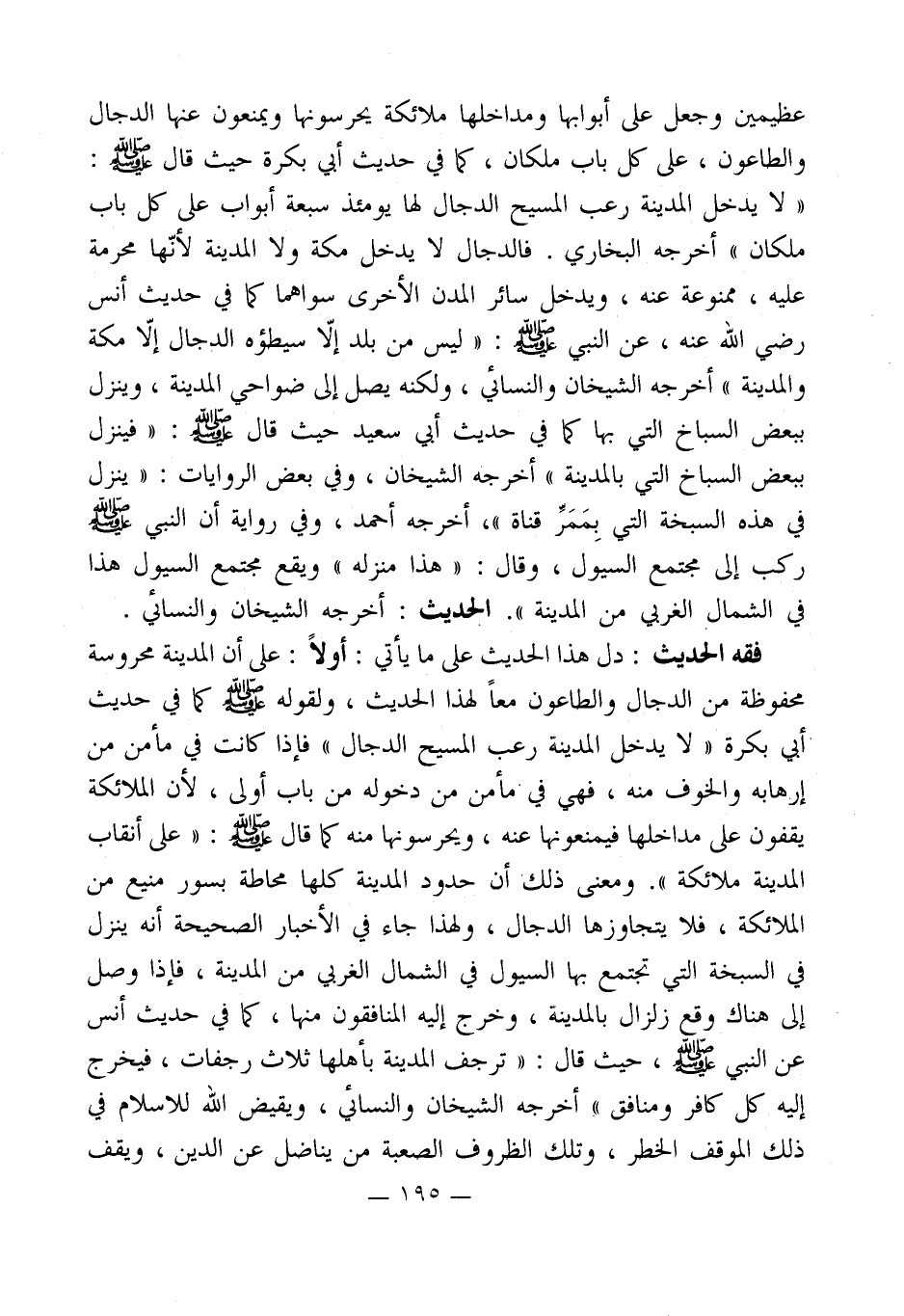 فقه الحديث: دل هذا الحديث على ما يأتي: أولاً: على أن المدينة محروسة محفوظة من الدجال والطاعون معاً لهذا الحديث، ولقوله - صلى الله عليه وسلم - كما في حديث أبي بكرة " لا يدخل المدينة رعب المسيح الدجال " فإذا كانت في مأمن من إرهابه والخوف منه، فهي في مأمن من دخوله من باب أولى، لأن الملائكة يقفون على مداخلها فيمنعونها عنه، ويحرسونها منه كما قال - صلى الله عليه وسلم -: " على أنقاب المدينة ملائكة ". ومعنى ذلك أن حدود المدينة كلها محاطة بسور منيع من الملائكة، فلا يتجاوزها الرجال، ولهذا جاء في الأخبار الصحيحة أنه ينزل في السبخة التي تجتمع بها السيول في الشمال الغربي من المدينة، فإذا وصل إلى هناك وقع زلزال بالمدينة، وخرج إليه المنافقون منها، كما في حديث أنس عن النبي - صلى الله عليه وسلم -، حيث قال: " ترجف المدينة بأهلها ثلاث رجفات، فيخرج إليه كل كافر ومنافق " أخرجه الشيخان والنسائي، ويقيض الله للاسلام في ذلك الموقف الخطر، وتلك الظروف الصعبة من يناضل عن الدين، ويقف