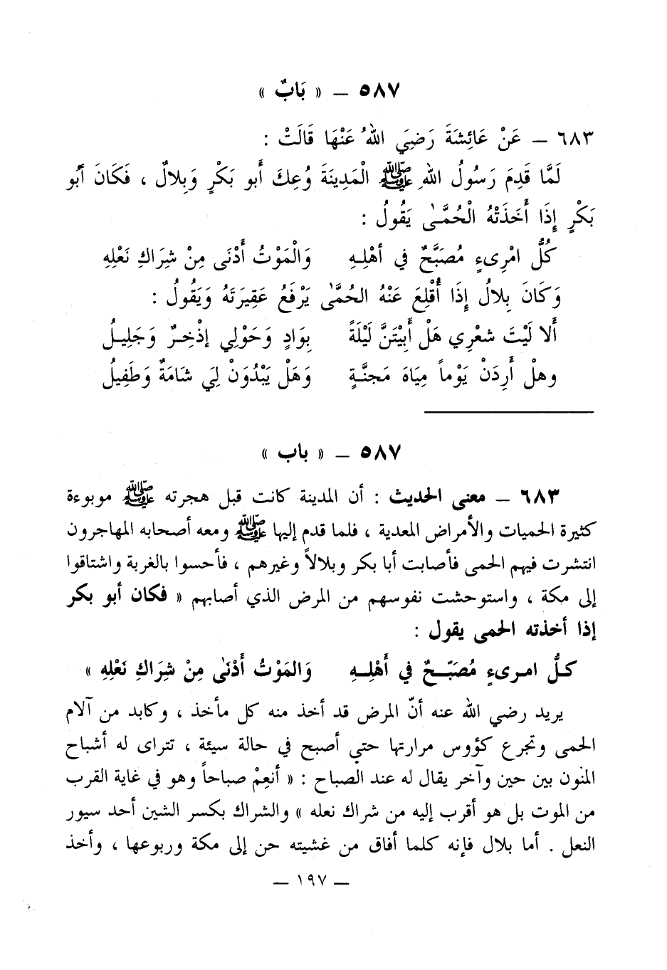 لَمَّا قَدِمَ رَسُولُ اللهِ - صلى الله عليه وسلم - الْمَدِينَةَ وُعِكَ أَبو بَكْرٍ وَبِلال، فَكَانَ - صلى الله عليه وسلم - أبو بَكْرٍ إِذَا أخَذَتْهُ الْحُمَّىْ يَقُولُ: