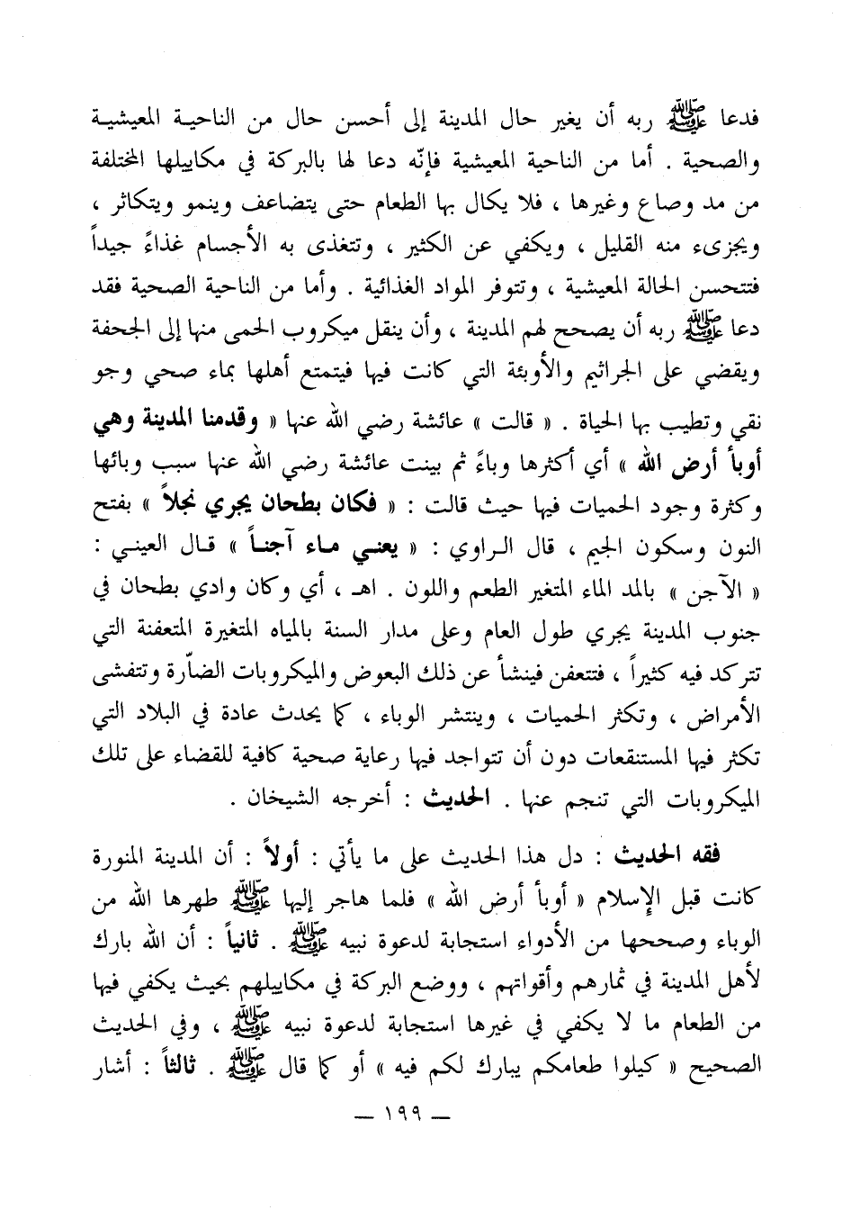فدعا - صلى الله عليه وسلم - ربه أن يغير حال المدينة إلى أحسن حال من الناحية المعيشية والصحية. أما من الناحية المعيشية فإنّه دعا لها بالبركة في مكاييلها المختلفة من مد وصاع وغيرها، فلا يكال بها الطعام حتى يتضاعف وينمو ويتكاثر، ويجزىء منه القليل، ويكفي عن الكثير، وتتغذى به الأجسام غذاءً جيداً فتتحسن الحالة المعيشية، وتتوفر المواد الغذائية. وأما من الناحية الصحية فقد دعا - صلى الله عليه وسلم - ربه أن يصحح لهم المدينة، وأن ينقل ميكروب الحمى منها إلى الجحفة ويقضي على الجراثيم والأوبئة التي كانت فيها فيتمتع أهلها بماء صحي وجو نقي وتطيب بها الحياة. " قالت " عائشة رضي الله عنها " وقدمنا المدينة وهي أوبأ أرض الله " أي أكثرها وباءً ثم بينت عائشة رضي الله عنها سبب وبائها وكثرة وجود الحميات فيها حيث قالت: " فكان بطحان يجري نجلاً " بفتح النون وسكون الجيم، قال الراوي: " يعني ماء آجناً " قال العيني: " الآجن " بالمد الماء المتغير الطعم واللون. اهـ، أي وكان وادي بطحان في جنوب المدينة يجري طول العام وعلى مدار السنة بالمياه المتغيرة المتعفنة التي تتركد فيه كثيراً، فتتعفن فينشأ عن ذلك البعوض والميكروبات الضاّرة وتتفشى الأمراض، وتكثر الحميات، وينتشر الوباء، كما يحدث عادة في البلاد التي تكثر فيها المستنقعات دون أن تتواجد فيها رعاية صحية كافية للقضاء على تلك الميكروبات التي تنجم عنها. الحديث: أخرجه الشيخان.