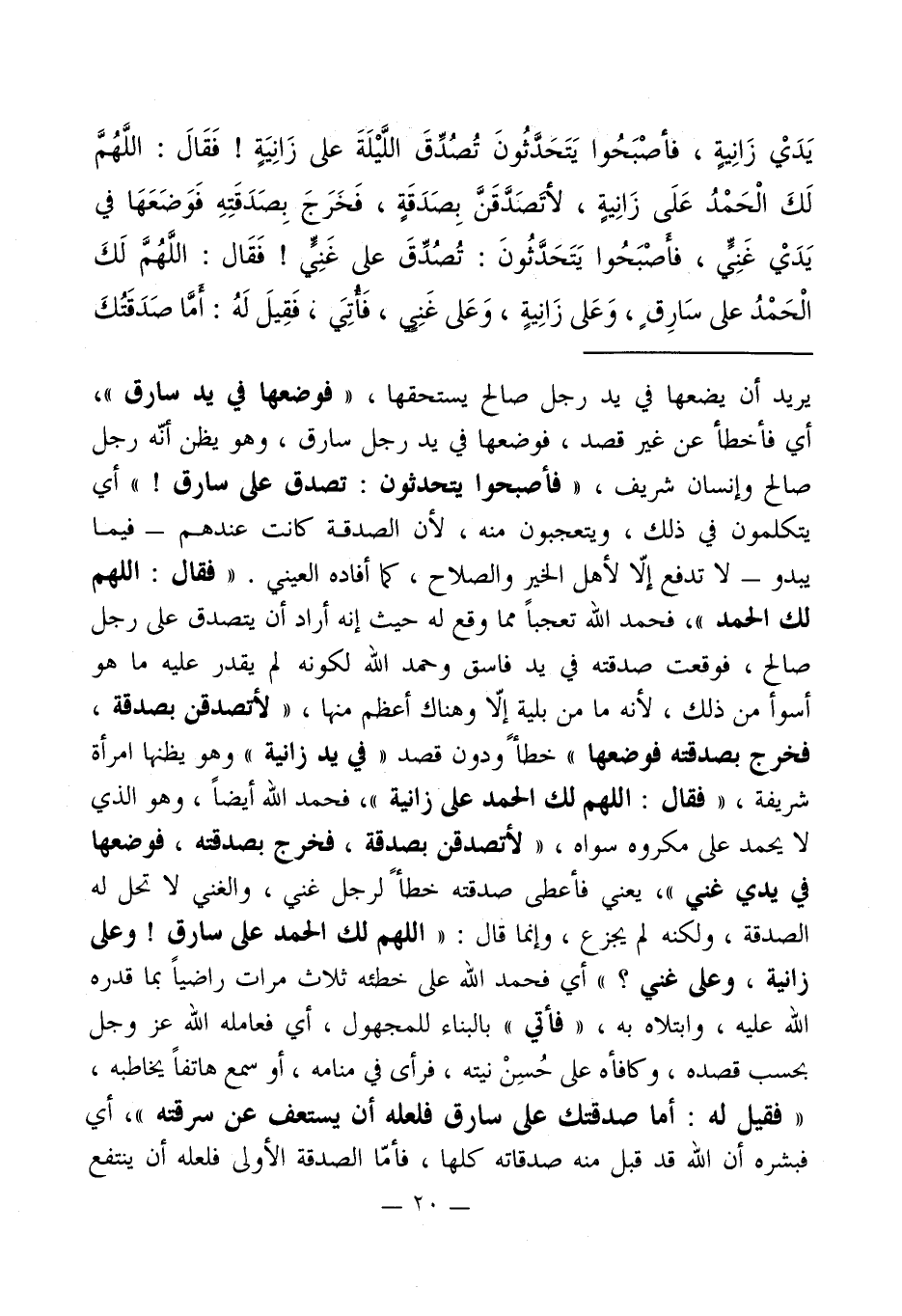 يريد أن يضعها في يد رجل صالح يستحقها، " فوضعها في يد سارق "، أي فأخطأ عن غير قصد، فوضعها في يد رجل سارق، وهو يظن أنّه رجل صالح وإنسان شريف، " فأصبحوا يتحدثون: تصدق على سارق! " أي يتكلمون في ذلك، ويتعجبون منه، لأن الصدقة كانت عندهم -فيما يبدو- لا تدفع إلاّ لأهل الخير والصلاح، كما أفاده العيني. " فقال: اللهم لك الحمد "، فحمد الله تعجباً مما وقع له حيث إنه أراد أن يتصدق على رجل صالح، فوقعت صدقته في يد فاسق وحمد الله لكونه لم يقدر عليه ما هو أسوأ من ذلك، لأنه ما من بلية إلاّ وهناك أعظم منها، " لأتصدقن بصدقة، فخرج بصدقته فوضعها " خطأً ودون قصد " في يد زانية " وهو يظنها امرأة شريفة، " فقال: اللهم لك الحمد على زانية "، فحمد الله أيضاً، وهو الذي لا يحمد على مكروه سواه، " لأتصدقن بصدقة، فخرج بصدقته، فوضعها في يدي غني "، يعني فأعطى صدقته خطأً لرجل غني، والغني لا تحل له الصدقة، ولكنه لم يجزع، وإنما قال: " اللهم لك الحمد على سارق! وعلى زانية، وعلى غني؟ " أي فحمد الله على خطئه ثلاث مرات راضياً بما قدره الله عليه، وابتلاه به، " فأتي " بالبناء للمجهول، أي فعامله الله عز وجل بحسب قصده، وكافأه على حُسِنْ نيته، فرأى في منامه، أو هاتفاً يخاطبه، " فقيل له: أما صدقتك على سارق فلعله أن يستعف عن سرقته "، أي فبشره أن الله قد قبل منه صدقاته كلها، فأمّا الصدقة الأولى فلعله أن ينتفع
