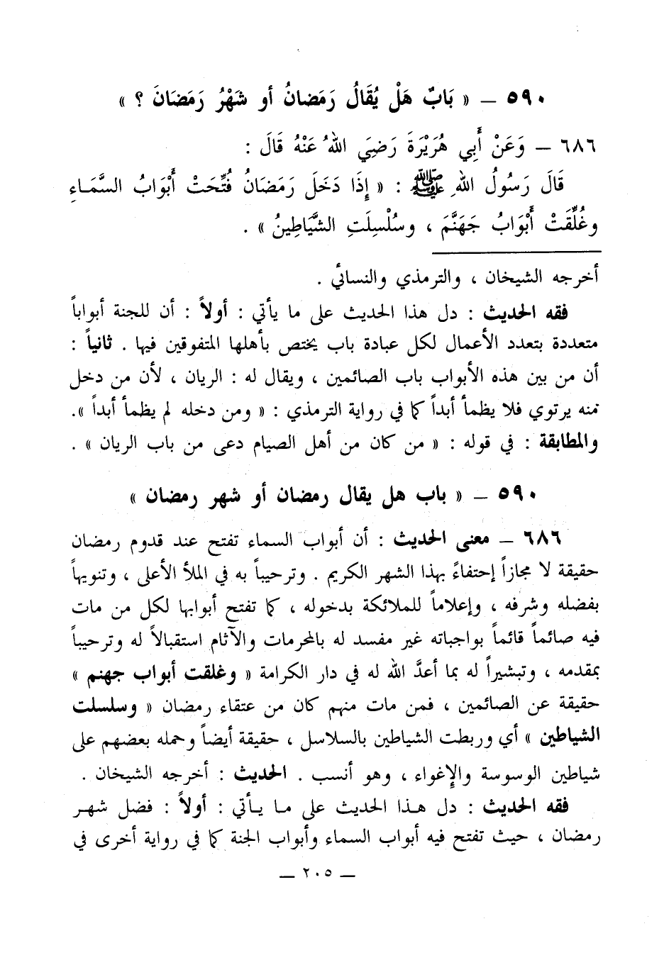 686 - معنى الحديث: أن أبواب السماء تفتح عند قدوم رمضان حقيقة لا مجازاً إحتفاءً بهذا الشهر الكريم. وترحيباً به في الملأ الأعلى، وتنويهاً بفضله وشرفه، وإعلاماً للملائكة بدخوله، كما تفتح أبوابها لكل من مات فيه صائماً قائماً بواجباته غير مفسد له بالمحرمات والآثام استقبالاً له وترحيباً بمقدمه، وتبشيراً له بما أعدَّ الله له في دار الكرامة " وغلقت أبواب جهنم " حقيقة عن الصائمين، فمن مات منهم كان من عتقاء رمضان " وسلسلت الشياطين " أي وربطت الشياطين بالسلاسل، حقيقة أيضاًً وحمله بعضهم على شياطين الوسوسة والإِغواء، وهو أنسب. الحديث: أخرجه الشيخان.
