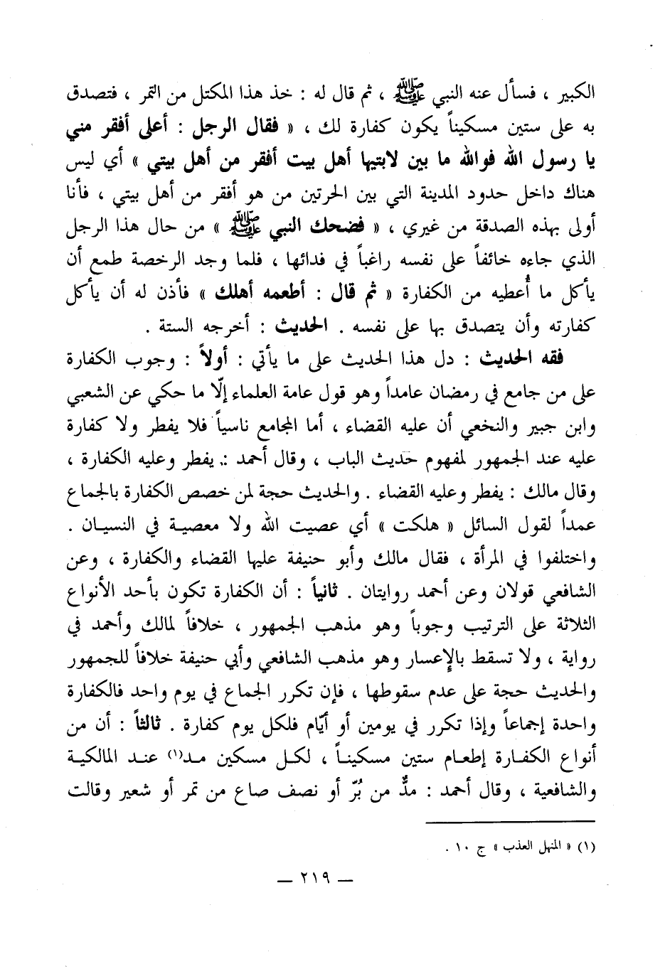الكبير، فسأل عنه النبي - صلى الله عليه وسلم -، ثم قال له: خذ هذا المكتل من التمر، فتصدق به على ستين مسكيناً يكون كفارة لك، " فقال الرجل: أعلى أفقر مني يا رسول الله فوالله ما بين لابتيها أهل بيت أفقر من أهل بيتي " أي ليس هناك داخل حدود المدينة التي بين الحرتين من هو أفقر من أهل بيتي، فأنا أولى بهذه الصدقة من غيري، " فضحك النبي - صلى الله عليه وسلم - " من حال هذا الرجل الذي جاءه خائفاً على نفسه راغباً في فدائها، فلما وجد الرخصة طمع أن يأكل ما أُعطيه من الكفارة " ثم قال: أطعمه " أهلك " فأذن له أن يأكل كفارته وأن يتصدق بها نفسه. الحديث: أخرجه الستة.