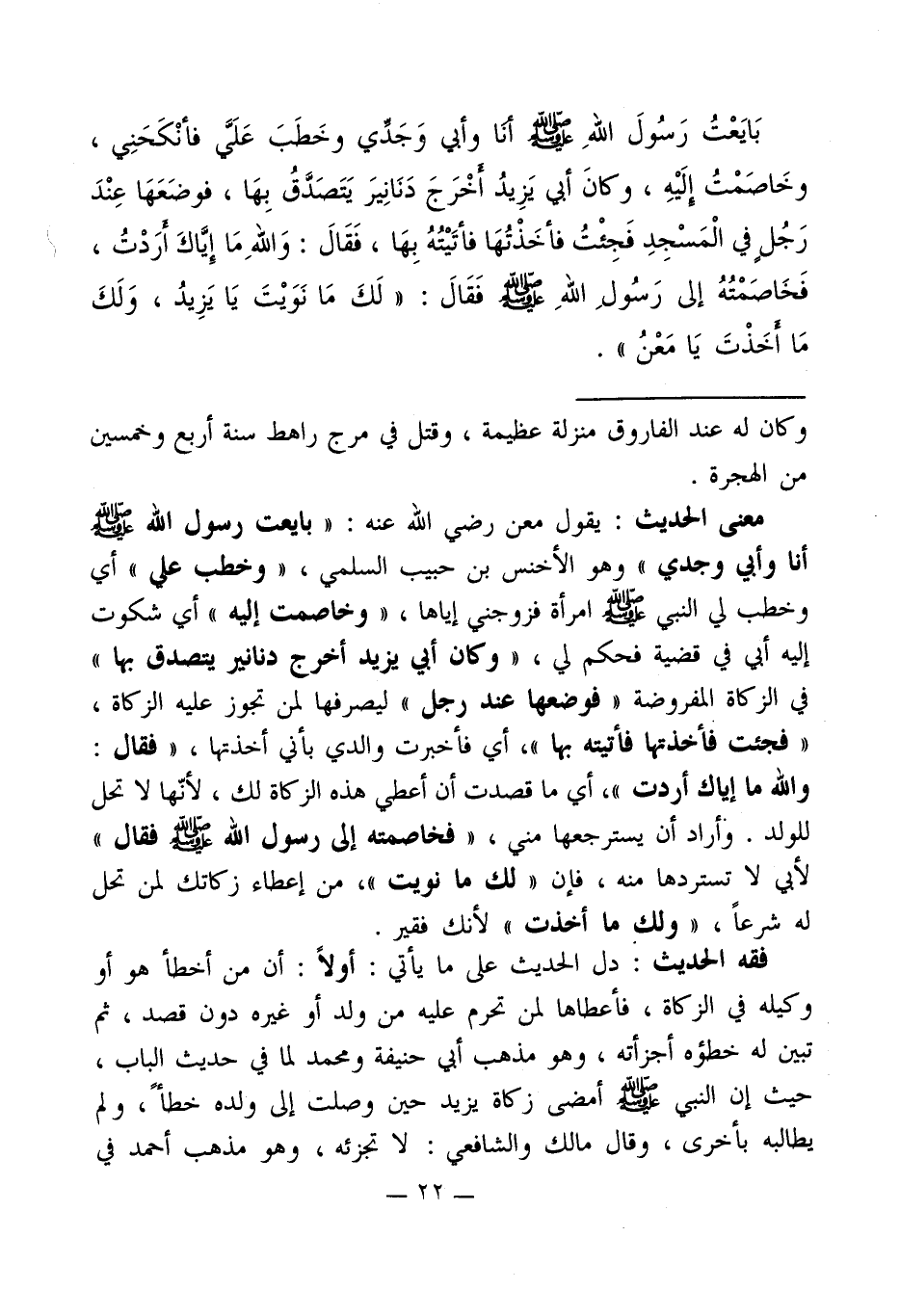 معنى الحديث: يقول معن رضي الله عنه: " بايعت رسول الله - صلى الله عليه وسلم - أنا وأبي وجدي " وهو الأخنس بن حبيب السلمي، " وخطب علي " أي وخطب لي النبي - صلى الله عليه وسلم - امرأة فزوجني إياها، " وخاصمت إليه " أي شكوت إليه أبي في قضية فحكم لي، " وكان أبي يزيد أخرج دنانير يتصدق بها " في الزكاة المفروضة " فوضعها عند رجل " ليصرفها لمن تجوز عليه الزكاة، " فجئت فأخذتها فأتيته بها "، أي فأخبرت والدي بأني أخذتها، " فقال: والله ما إياك أردت "، أي ما قصدت أن أعطي هذه الزكاة لك، لأنّها لا تحل للولد. وأراد أن يسترجعها مني، " فخاصمته إلى رسول الله - صلى الله عليه وسلم - فقال " لأبي لا تستردها منه، فإن " لك ما نويت "، من إعطاء زكاتك لمن تحل له شرعاً، " ولك ما أخذت " لأنك فقير.