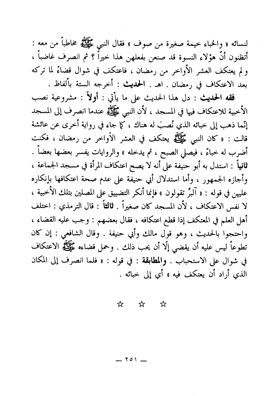 ثانياًً: استدل به أبو حنيفة - صلى الله عليه وسلم - أنه لا يصح اعتكاف المرأة في مسجد الجماعة، وأجازه الجمهور، وأما استدلال أبي حنيفة على عدم صحة اعتكافها بإنكاره عليهن في قوله: " آلبرِّ تقولون " فإنما أنكر التضييق على المصلين بتلك الأخبية، لا نفس الاعتكاف، لأن المسجد كان صغيراً. ثالثاً: قال الترمذي: اختلف أهل العلم في المعتكف إذا قطع اعتكافه، فقال بعضهم: وجب عليه القضاء، واحتجوا بالحديث، وهو قول مالك وأبي حنيفة. وقال الشافعي: إن كان تطوعاً ليس عليه أن يقضي إلا أن يحب ذلك. وحمل قضاءه - صلى الله عليه وسلم - الاعتكاف في شوال على الاستحباب. والمطابقة: في قوله: " فلما انصرف إلى المكان الذي أراد أن يعتكف فيه " أي إلى خبائه.