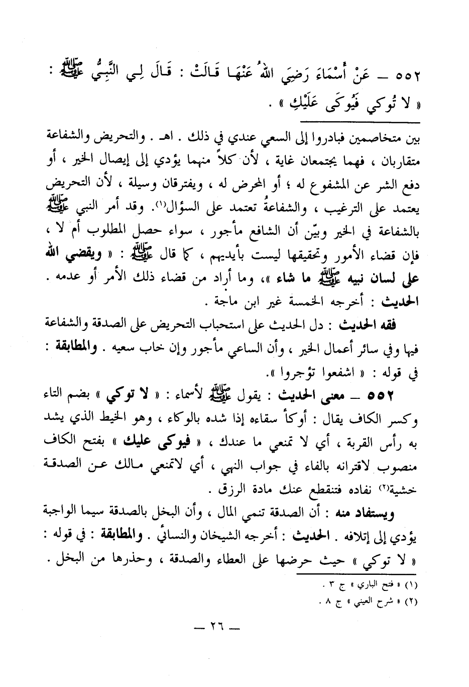 552 - معنى الحديث: يقول - صلى الله عليه وسلم - لأسماء: " لا توكي " بضم التاء وكسر الكاف يقال: أوكأ سقاءه إذا شده بالوكاء، وهو الخيط الذي يشد به رأس القربة، أي لا تمنعي ما عندك، " فيوكى عليك " بفتح الكاف منصوب لاقترانه بالفاء في جواب النهي، أي لا تمنعي مالك عن الصدقة خشية (¬2) نفاده فتنقطع عنك مادة الرزق.