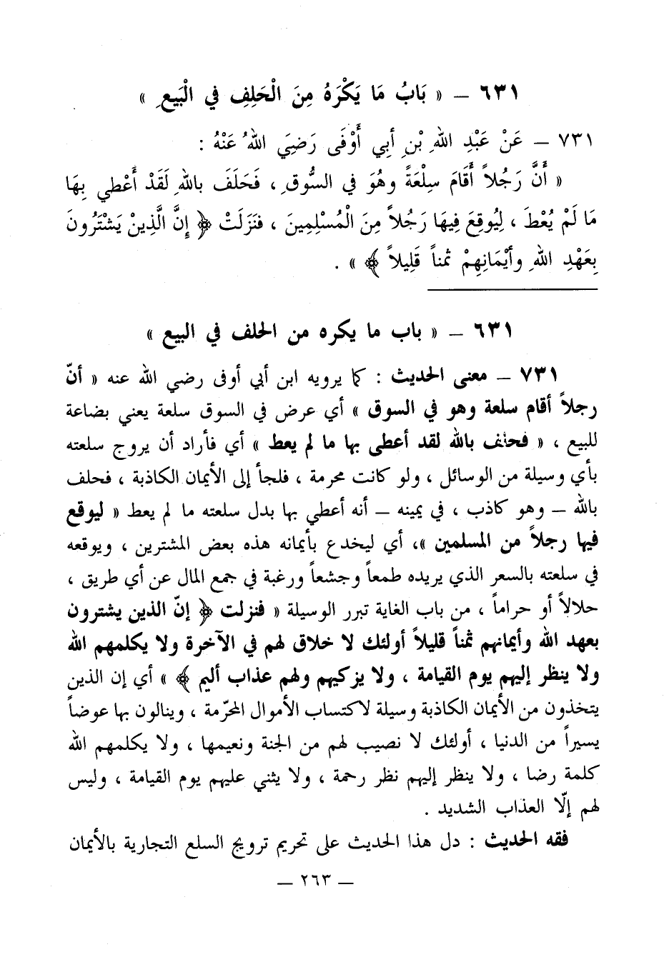 731 - معنى الحديث: كما يرويه ابن أبي أوفى رضي الله عنه " أنّ رجلاً أقام سلعة وهو في السوق " أي عرض في السوق سلعة يعني بضاعة للبيع، " فحلف بالله لقد أعطى بما ما لم يعط " أي فأراد أن يروج سلعته بأي وسيلة من الوسائل، ولو كانت محرمة، فلجأ إلى الأيمان الكاذبة، فحلف بالله -وهو كاذب، في يمينه- أنه أعطي بها بدل سلعته ما لم يعط " ليوقع فيها رجلاً من المسلمين "، أي ليخدع بأيمانه هذه بعض المشترين، ويوقعه في سلعته بالسعر الذي يريده طمعاً وجشعاً ورغبة في جمع المال عن أي طريق، حلالاً أو حراماً، من باب الغاية تبرر الوسيلة " فنزلت (إِنَّ الَّذِينَ يَشْتَرُونَ بِعَهْدِ اللَّهِ وَأَيْمَانِهِمْ ثَمَنًا قَلِيلًا أُولَئِكَ لَا خَلَاقَ لَهُمْ فِي الْآَخِرَةِ وَلَا يُكَلِّمُهُمُ اللَّهُ وَلَا يَنْظُرُ إِلَيْهِمْ يَوْمَ الْقِيَامَةِ وَلَا يُزَكِّيهِمْ وَلَهُمْ عَذَابٌ أَلِيمٌ) " أي إن الذين يتخذون من الأيمان الكاذبة وسيلة لاكتساب الأموال المحرّمة، وينالون بها عوضاً يسيراً من الدنيا، أولئك لا نصيب لهم من الجنة ونعيمها، ولا يكلمهم الله كلمة رضا، ولا ينظر إليهم نظر رحمة، ولا يثني عليهم يوم القيامة، وليس لهم إلاّ العذاب الشديد.