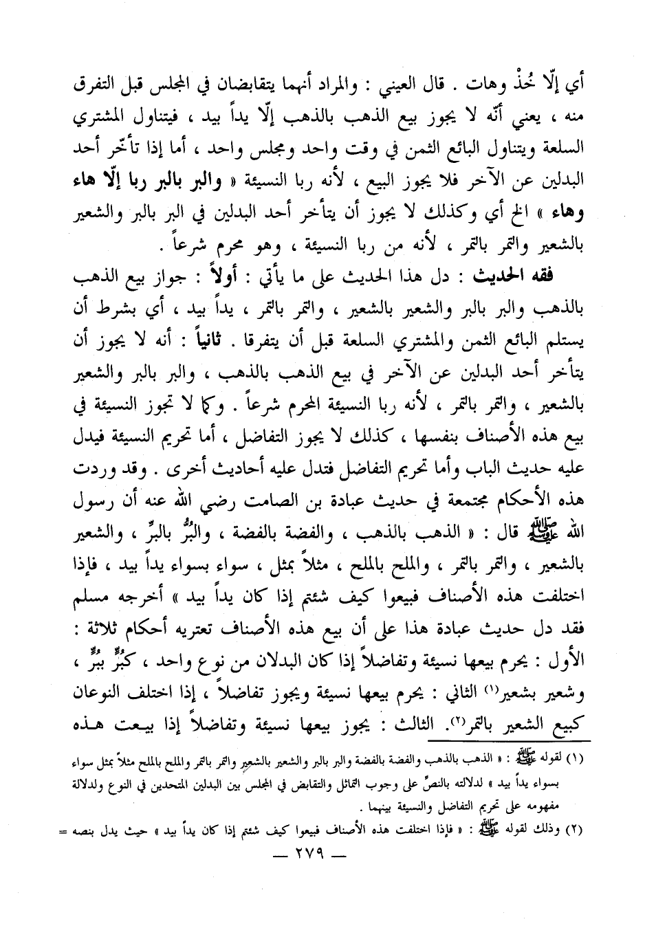 فقه الحديث: دل هذا الحديث على ما يأتي: أولاً: جواز بيع الذهب بالذهب والبر بالبر والشعير بالشعير، والتمر بالتمر، يداً بيد، أي بشرط أن يستلم البائع الثمن والمشتري السلعة قبل أن يتفرقا. ثانياًًً: أنه لا يجوز أن يتأخر أحد البدلين عن الآخر في بيع الذهب بالذهب، والبر بالبر والشعير بالشعير، والتمر بالتمر، لأنه ربا النسيئة المحرم شرعاً. وكما لا تجوز النسيئة في بيع هذه الأصناف بنفسها، كذلك لا يجوز التفاضل، أما تحريم النسيئة فيدل عليه حديث الباب وأما تحريم التفاضل فتدل عليه أحاديث أخرى. وقد وردت هذه الأحكام مجتمعة في حديث عبادة بن الصامت رضي الله عنه أن رسول الله - صلى الله عليه وسلم - قال: " الذهب بالذهب، والفضة بالفضة، والبُرُّ بالبرِّ، والشعير بالشعير، والتمر بالتمر، والملح بالملح، مثلاً بمثل، سواء بسواء يداً بيد، فإذا اختلفت هذه الأصناف فبيعوا كيف شئتم إذا كان يداً بيد " أخرجه مسلم فقد دل حديث عبادة هذا على أن بيع هذه الأصناف تعتريه أحكام ثلاثة: