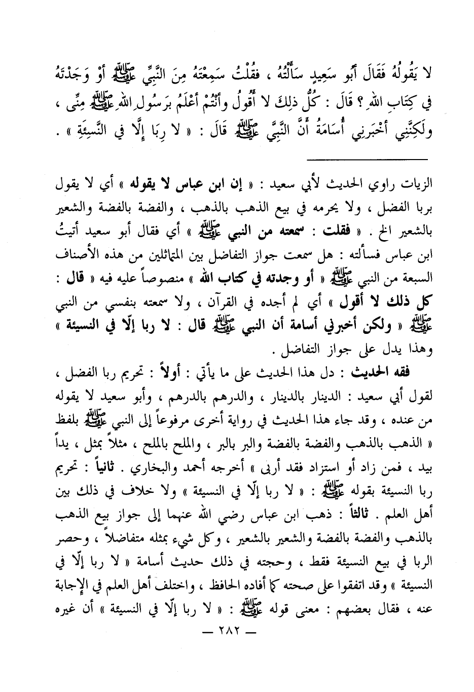 الزيات راوي الحديث لأبي سعيد: " إن ابن عباس لا يقوله " أي لا يقول بربا الفضل، ولا يحرمه في بيع الذهب بالذهب، والفضة بالفضة والشعير بالشعير الخ. " فقلت: سمعته من النبي - صلى الله عليه وسلم - " أي فقال أبو سعيد أتيتُ ابن عباس فسألته: هل سمعت جواز التفاضل بين المتماثلين من هذه الأصناف السبعة من النبي - صلى الله عليه وسلم - " أو وجدته في كتاب الله " منصوصاً عليه فيه " قال: كل ذلك لا أقول " أي لم أجده في القرآن، ولا سمعته بنفسي من النبي - صلى الله عليه وسلم - " ولكن أخبرني أسامة أن النبي - صلى الله عليه وسلم - قال: لا ربا إلاّ في النسيئة " وهذا يدل على جواز التفاضل.