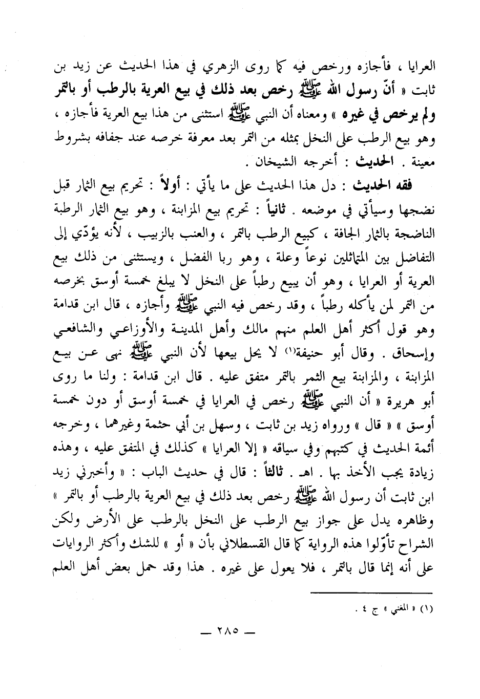 العرايا، فأجازه ورخص فيها كما روى الزهري في هذا الحديث عن زيد بن ثابت " أنّ رسول الله - صلى الله عليه وسلم - رخص بعد ذلك في بيع العرية بالرطب أو بالتمر ولم يرخص في غيره " ومعناه أن النبي - صلى الله عليه وسلم - استثنى من هذا بيع العرية فأجازه، وهو بيع الرطب على النخل من التمر بعد معرفة خرصه عند جفافه بشروط معينة. الحديث: أخرجه الشيخان.