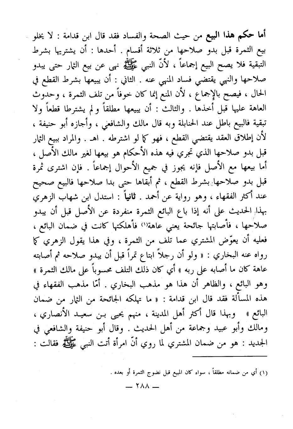 أما حكم هذا البيع من حيث الصحة والفساد فقد قال ابن قدامة: لا يخلو بيع الثمرة قبل بدو صلاحها من ثلاثة أقسام. أحدها: أن يشتريها بشرط التبقية فلا يصح البيع إجماعاً، لأنّ النبي - صلى الله عليه وسلم - نهى عن بيع الثمار حتى يبدو صلاحها والنهى يقتضي فساد المنهي عنه. الثاني: أن يبيعها بشرط القطع في الحال، فيصح بالإِجماع، لأن المنع إنما كان خوفاً من تلف الثمرة، وحدوث العاهة عليها قبل أخذها. والثالث: أن يبيعها مطلقاً ولم يشترطا قطعاً ولا تبقية فالبيع باطل عند الحنابلة وبه قال مالك والشافعي، وأجازه أبو حنيفة، لأن إطلاق العقد يقتضي القطع، فهو كما لو اشترطه. اهـ. والمراد ببيع الثمار قبل بدو صلاحها الذي تجري فيه هذه الأحكام هو بيعها لغير مالك الأصل، أما بيعها مع الأصل فإنه يجوز في جميع الأحوال إجماعاً. فإن اشترى ثمرة قبل بدو صلاحها: بشرط القطع، ثم أبقاها حتى بدا صلاحها فالبيع صحيح عند أكثر الفقهاء، وهو رواية عن أحمد. ثانياًًً: استدل ابن شهاب الزهري بهذا الحديث على أنه إذا باع البائع الثمرة منفردة عن الأصل قبل أن يبدو صلاحها، فأصابتها جائحة يعني عاهة (¬1) فأهلكتها كانت في ضمان البائع، فعليه أن يعوّض المشتري عما تلف من الثمرة، وفي هذا يقول الزهري كما رواه عنه البخاري: " ولو أن رجلاً ابتاع تمراً قبل أن يبدو صلاحه ثم أصابته عاهة كان ما أصابه على ربه " أي كان ذلك التلف محسوباً على مالك الثمرة " وهو البائع، والظاهر أن هذا هو مذهب البخاري. أمّا مذهب الفقهاء في هذه المسألة فقد قال ابن قدامة: " ما تهلكه الجائحة من الثمار من ضمان البائع " وبهذا قال أكثر أهل المدينة، منهم يحيى بن سعيد الأنصاري، ومالك وأبو عبيد وجماعة من أهل الحديث. وقال أبو حنيفة والشافعي في الجديد: هو من ضمان المشتري لما روي أنّ امرأة أتت النبي - صلى الله عليه وسلم - فقالت: