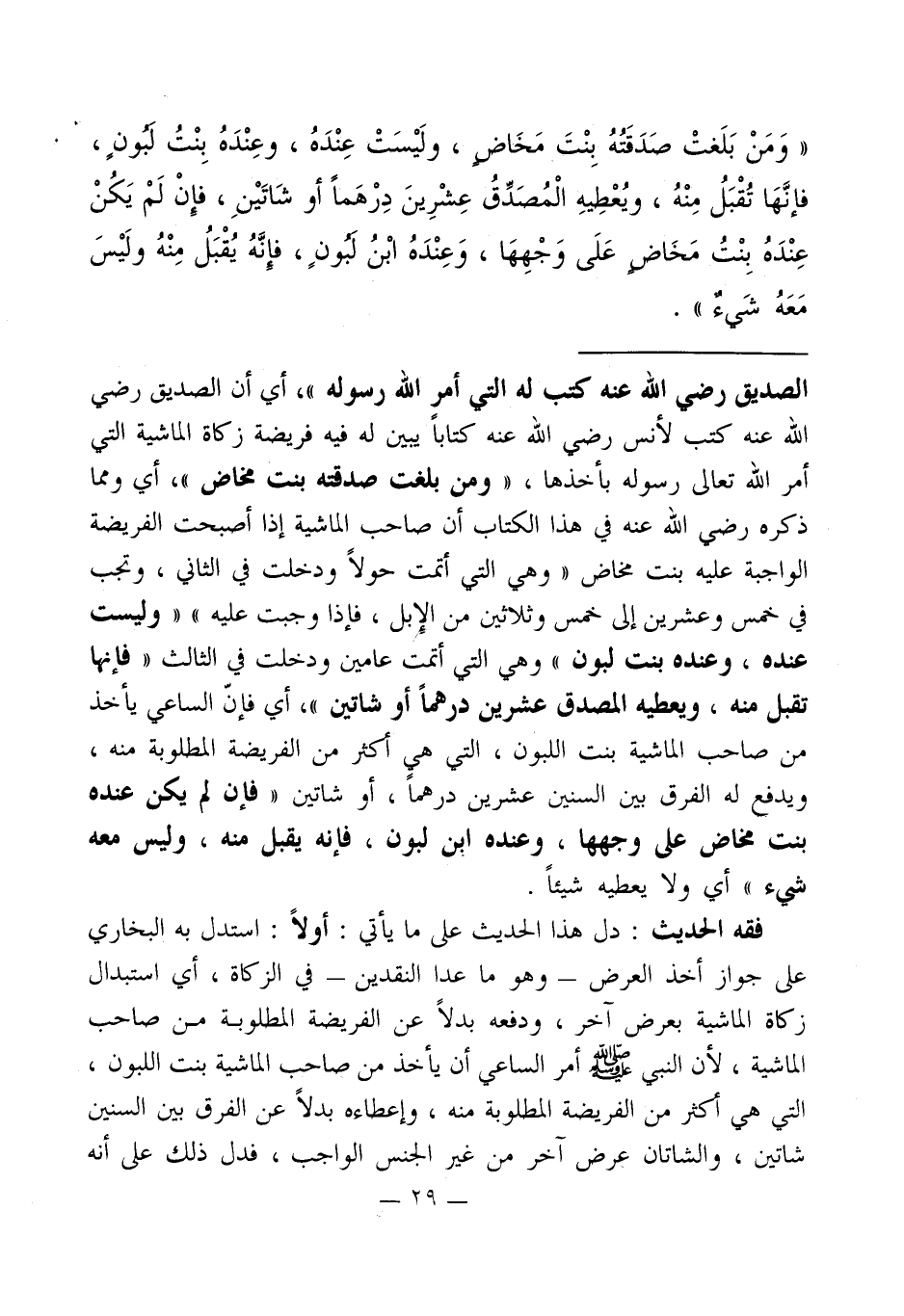 فقه الحديث: دل هذا الحديث على ما يأتي: أولاً: استدل به البخاري على جواز أخذ العرض - وهو ما عدا النقدين - في الزكاة، أي استبدال زكاة الماشية بعرض آخر، ودفعه بدلاً عن الفريضة المطلوبة من صاحب الماشية، لأن النبي - صلى الله عليه وسلم - أمر الساعي أن يأخذ من صاحب الماشية بنت اللبون، التي هي أكثر من الفريضة المطلوبة منه، وإعطاءه بدلاً عن الفرق بين السنين شاتين، والشاتان عرض آخر من غير الجنس الواجب، فدل ذلك على أنه