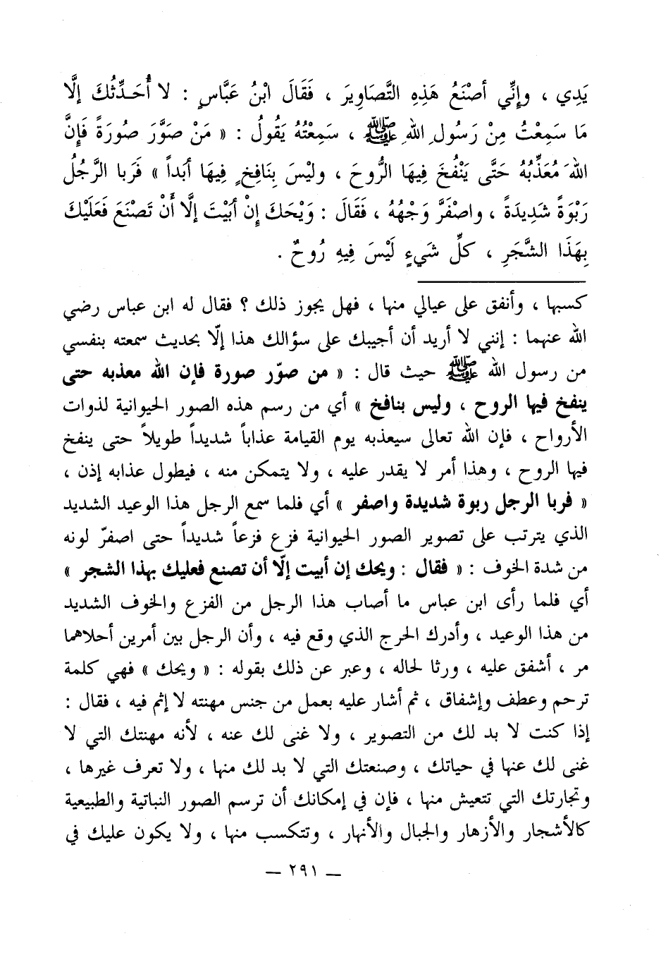 كسبها، وأنفق على عيالي منها، فهل يجوز ذلك؟ فقال له ابن عباس رضي الله عنهما: إنني لا أريد أن أجيبك على سؤالك هذا إلاّ بحديث سمعته بنفسي من رسول الله - صلى الله عليه وسلم - حيث قال: " من صوّر صورة فإن الله معذبه حتى ينفخ في الروح، وليس بنافخ " أي من رسم هذه الصور الحيوانية لذوات الأرواح، فإن الله تعالى سيعذبه يوم القيامة عذاباً شديداً طويلاً حتى ينفخ فيها الروح، وهذا أمر لا يقدر عليه، ولا يتمكن منه، فيطول عذابه إذن، " فربا الرجل ربوة شديدة واصفر " أي فلما سمع الرجل هذا الوعيد الشديد الذي يترتب على تصوير الصور الحيوانية فزع فزعاً شديداً حتى اصفرّ لونه من شدة الخوف: " فقال: ويحك إن أبيت إلاّ أن تصنع فعليك هذا الشجر " أي فلما رأى ابن عباس ما أصاب هذا الرجل من الفزع والخوف الشديد من هذا الوعيد، وأدرك الحرج الذي وقع فيه، وأن الرجل بين أمرين أحلاهما مر، أشفق عليه، ورثا لحاله، وعبر عن ذلك بقوله: " ويحك " فهي كلمة ترحم وعطف وإشفاق، ثم أشار عليه بعمل من جنس مهنته لا إثم فيه، فقال: إذا كنت لا بد لك من التصوير، ولا غنى لك عنه، لأنه مهنتك التي لا غنى لك عنها في حياتك، وصنعتك التي لا بد لك منها، ولا تعرف غيرها، وتجارتك التي تتعيش منها، فإن في إمكانك أن ترسم الصور النباتية والطبيعية كالأشجار والأزهار والجبال والأنهار، وتتكسسب منها، ولا يكون عليك في