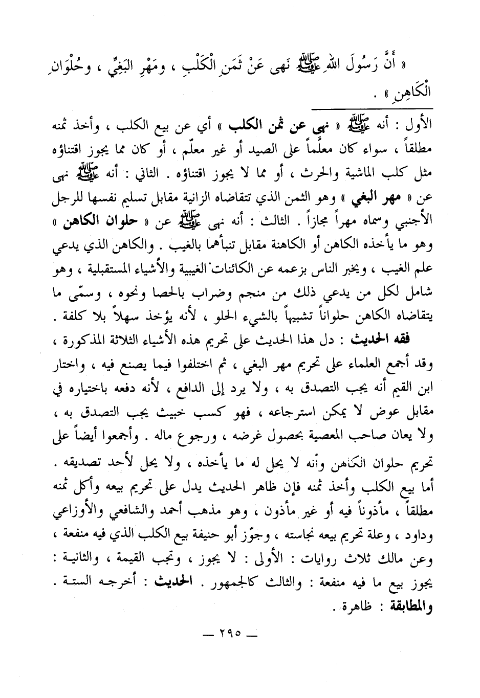 الأول: أنه - صلى الله عليه وسلم - " نهى عن ثمن الكلب " أي عن بيع الكلب، وأخذ ثمنه مطلقاً، سواء كان معلَّماً على الصيد أو غير معلّم، أو كان مما يجوز اقتناؤه مثل كلب الماشية والحرث، أو مما لا يجوز اقتناؤه. الثاني: أنه - صلى الله عليه وسلم - نهى عن " مهر البغي " وهو الثمن الذي تتقاضاه الزانية مقابل تسليم نفسها للرجل الأجنبي وسماه مهراً مجازاً. الثالث: أنه نهى - صلى الله عليه وسلم - عن " حلوان الكاهن " وهو ما يأخذه الكاهن أو الكاهنة مقابل تنبأهما بالغيب. والكاهن الذي يدعي علم الغيب، ويخبر الناس بزعمه عن الكائنات الغيبية والأشياء المستقبلية، وهو شامل لكل من يدعي ذلك من منجم وضراب بالحصا ونحوه، وسمّى ما يتقاضاه الكاهن حلواناً تشبيهاً بالشيء الحلو، لأنه يؤخذ سهلاً بلا كلفة.