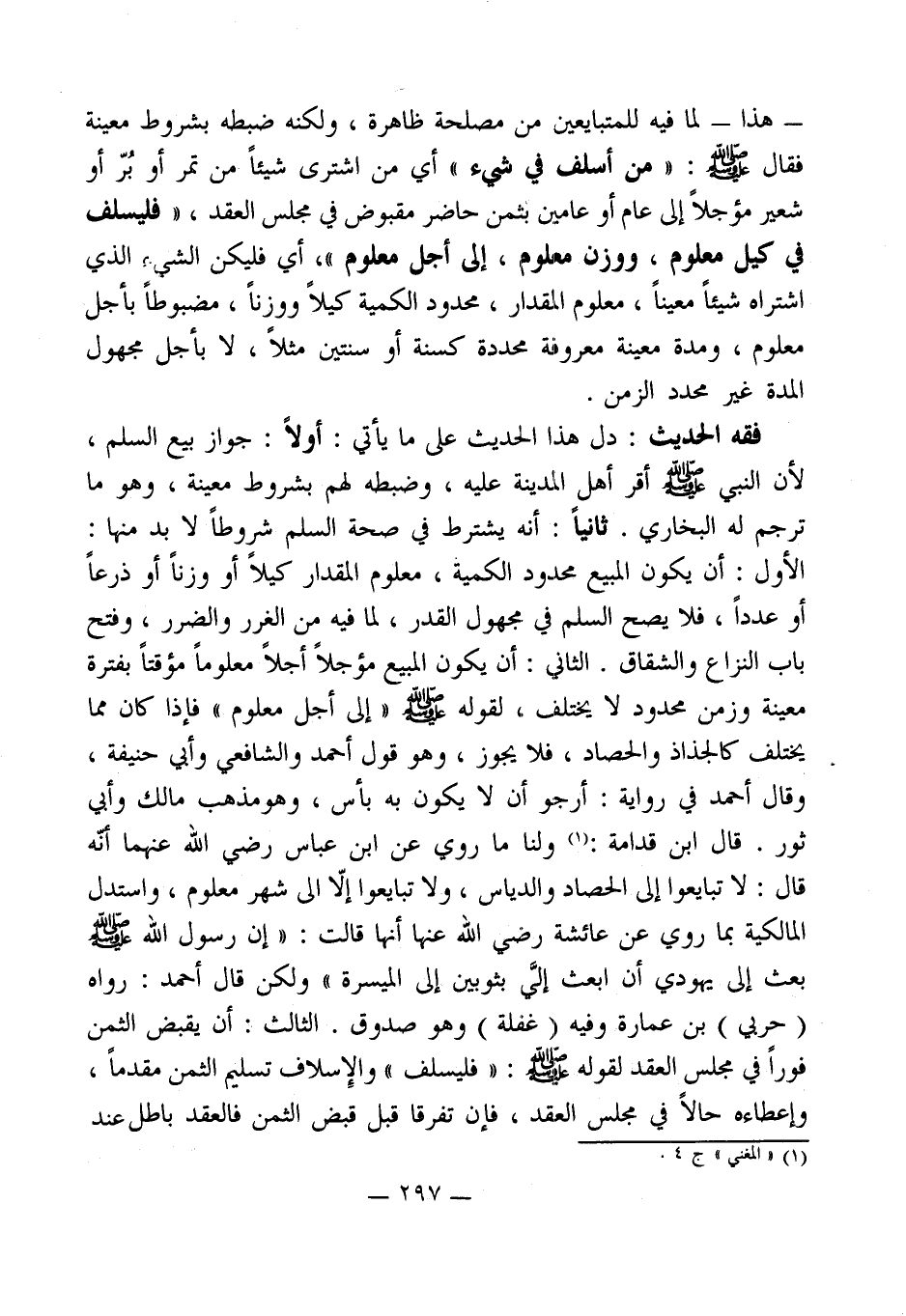 -هذا- لما فيه للمتبايعين من مصلحة ظاهرة، ولكنه ضبطه بشروط معينة فقال - صلى الله عليه وسلم -: " من أسلف في شيء " أي من اشترى شيئاً من تمر أو بُرّ أو شعير مؤجلاً إلى عام أو عامين بثمن حاضر مقبوض في مجلس العقد، " فيسلف في كيل معلوم، ووزن معلوم، إلى أجل معلوم "، أي فليكن الشيء الذي اشتراه شيئاً معيناً، معلوم المقدار، محدود الكمية كيلاً ووزناً، مضبوطاً بأجل معلوم، ومدة معينة معروفة محددة كسنة أو سنتين مثلاً، لا بأجل مجهول المدة غير محدد الزمن.