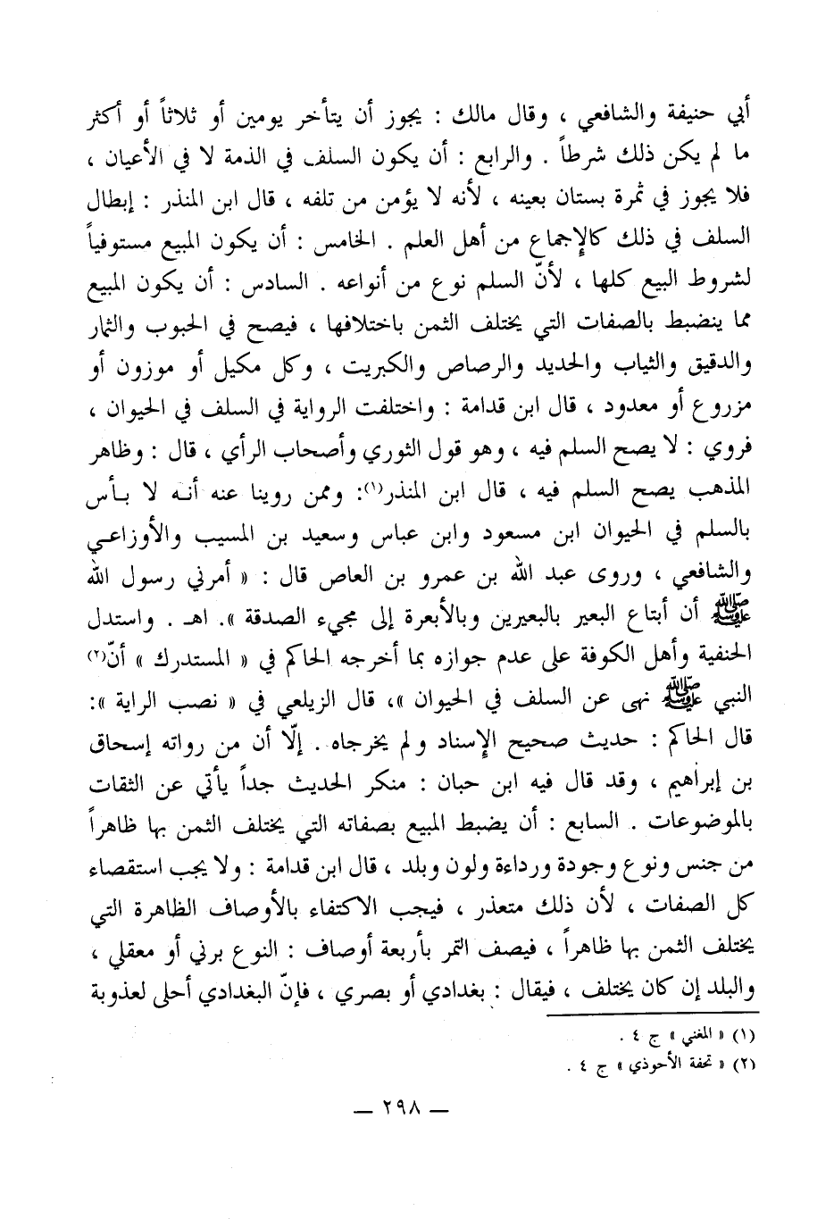 أبي حنيفة والشافعي، وقال مالك: يجوز أن يتأخر يومين أو ثلاثاً أو أكثر ما لم يكن ذلك شرطاً. والرابع: أن يكون السلف في الذمة لا في الأعيان، فلا يجوز في ثمرة بستان بعينه، لأنه لا يؤمن من تلفه، قال ابن المنذر: إبطال السلف في ذلك كالإِجماع من أهل العلم. الخامس: أن يكون المبيع مستوفياً لشروط البيع كلها، لأنّ السلم نوع من أنواعه. السادس: أن يكون المبيع مما ينضبط بالصفات التي يختلف الثمن باختلافها، فيصح في الحبوب والثمار والدقيق والثياب والحديد والرصاص والكبريت، وكل مكيل أو موزون أو مزروع أو معدود، قال ابن قدامة: واختلفت الرواية في السلف في الحيوان، فروي: لا يصح السلم فيه، وهو قول الثوري وأصحاب الرأي، قال: وظاهر المذهب يصح السلم فيه، قال ابن المنذر (¬1): وممن روينا عنه أنه لا بأس بالسلم في الحيوان ابن مسعود وابن عباس وسعيد بن المسيب والأوزاعي والشافعي، وروى عبد الله بن عمرو بن العاص قال: " أمرني رسول الله - صلى الله عليه وسلم - أن أبتاع البعير بالبعيرين وبالأبعرة إلى مجيء الصدقة ". اهـ. واستدل الحنفية وأهل الكوفة على عدم جوازه بما أخرجه الحاكم في " المستدرك " أنّ (¬2) النبي - صلى الله عليه وسلم - نهى عن السلف في الحيوان "، قال الزيلعي في " نصب الراية ": قال الحاكم: حديث صحيح الإِسناد ولم يخرجاه. إلاّ أن من رواته إسحاق بن إبراهيم، وقد قال فيه ابن حبان: منكر الحديث جداً يأتي عن الثقات بالموضوعات. السابع: أن يضبط المبيع بصفاته التي يختلف الثمن بها ظاهراً من جنس ونوع وجودة ورداءة ولون وبلد، قال ابن قدامة: ولا يجب استقصاء كل الصفات، لأن ذلك متعذر، فيجب الاكتفاء بالأوصاف الظاهرة التي يختلف الثمن بها ظاهراً، فيصف التمر بأربعة أوصاف: النوع برني أو معقلي، والبلد إن كان يختلف، فيقال: بغدادي أو بصري، فإنّ البغدادي أحلى لعذوبة