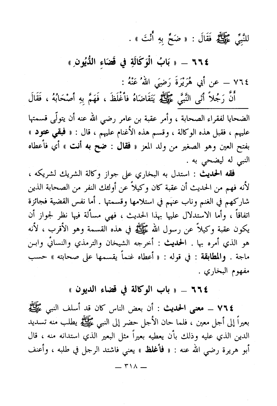 فقه الحديث: استدل به البخاري على جواز وكالة الشريك لشريكه، لأنه فهم من الحديث أن عقبة كان وكيلاً عن أولئك النفر من الصحابة الذين شاركهم في الغنم وناب عنهم في استلامها وقسمتها. أما نفس القضية فجائزة اتفاقاً، وأما الاستدلال عليها بهذا الحديث، فهي مسألة فيها نظر لجواز أن يكون عقبة وكيلاً عن رسول الله - صلى الله عليه وسلم - في هذه القسمة وهو الأقرب، لأنه هو الذي أمره بها. الحديث: أخرجه الشيخان والترمذي والنسائي وابن ماجة. والمطابقة: في قوله: " أعطاه غنماً يقسمها على صحابته " حسب مفهوم البخاري.