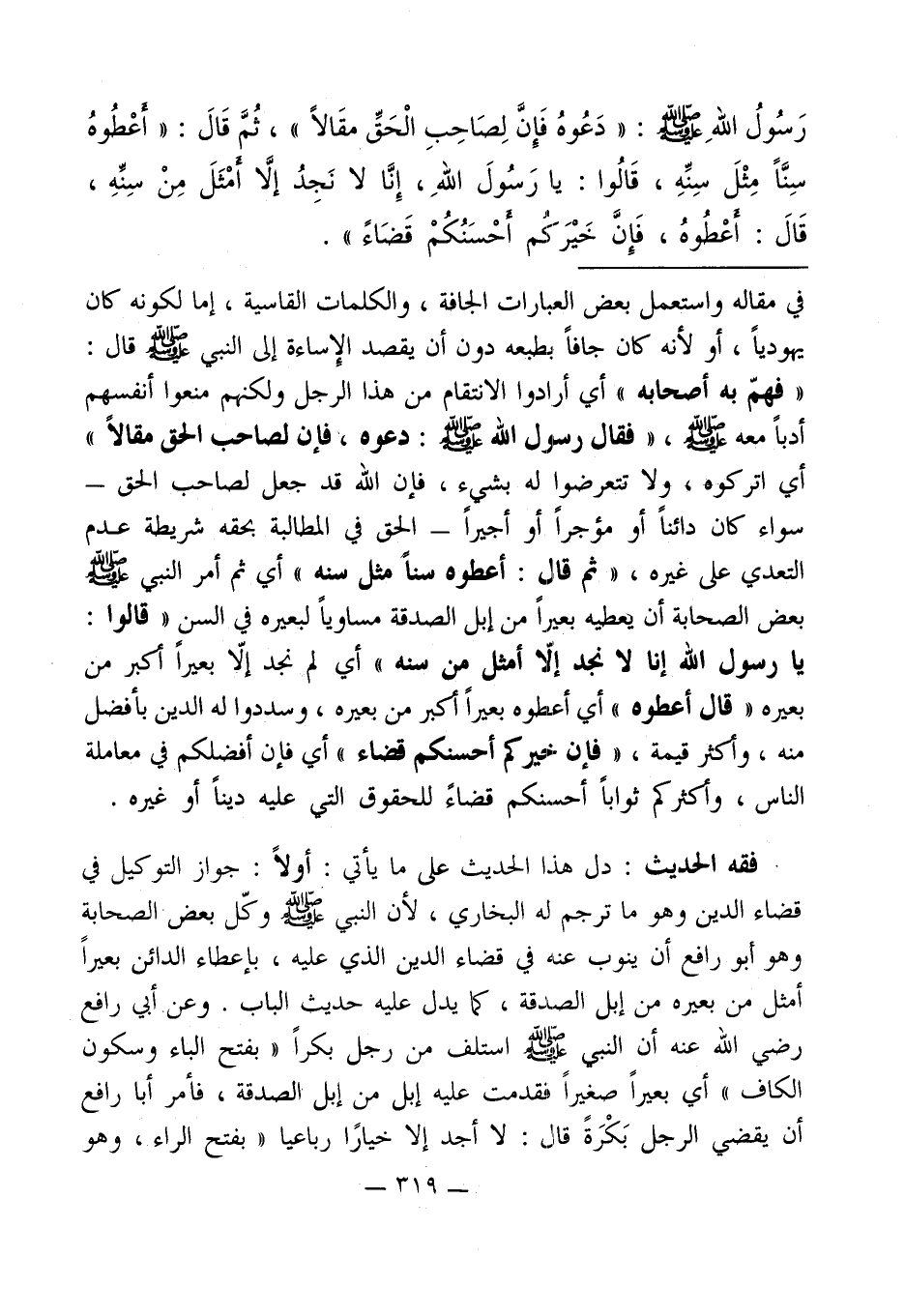 فقه الحديث: دل هذا الحديث على ما يأتي: أولاً: جواز التوكيل في قضاء الدين وهو ما ترجم له البخاري، لأن النبي - صلى الله عليه وسلم - وكّل بعض الصحابة وهو أبو رافع أن ينوب عنه في قضاء الدين الذي عليه، بإعطاء الدائن بعيراً أمثل من بعيره من إبل الصدقة، كما يدل عليه حديث الباب. وعن أبي رافع رضي الله عنه أن النبي - صلى الله عليه وسلم - استلف من رجل بكراً " بفتح الباء وسكون الكاف " أي بعيراً صغيراً فقدمت عليه إبل من إبل الصدقة، فأمر أبا رافع أن يقضي الرجل بَكْرَةً قال: لا أجد إلا خيارًا رباعياً "بفتح الراء، وهو